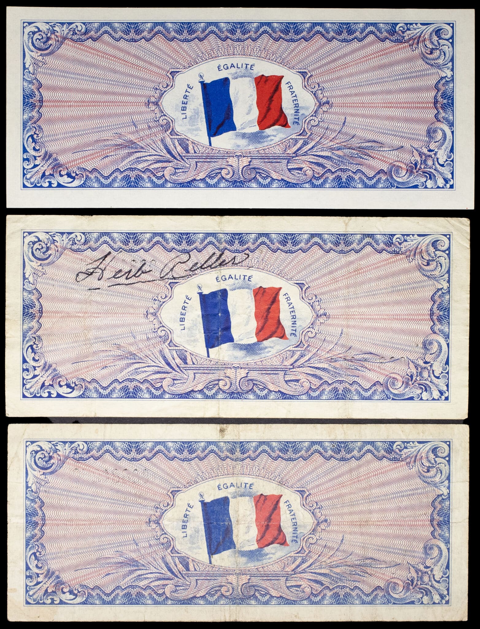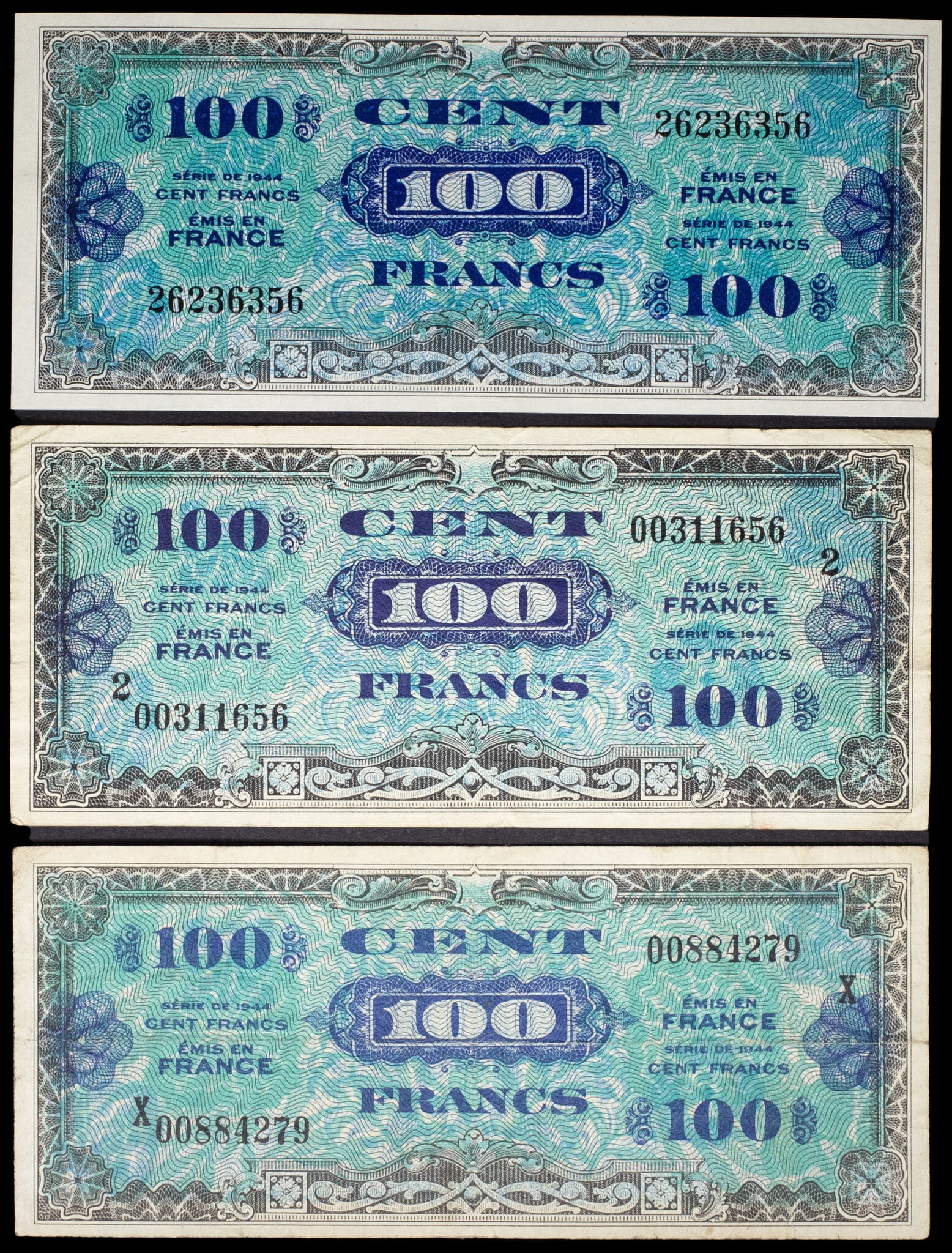 - Lot (3) - 100 francs type “Drapeau” (série complète) 1944.
