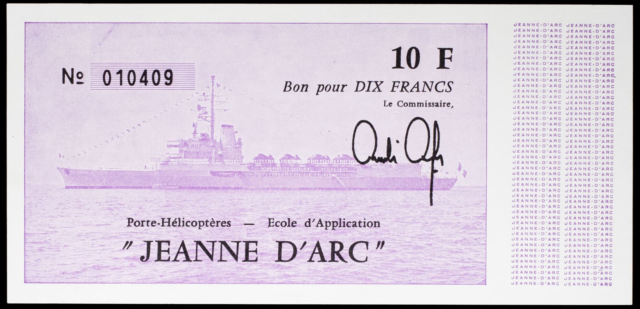 - 10 francs type “Porte-Hélicoptères - École d’Application Jeanne d’Arc” violet ND (1980-1981).