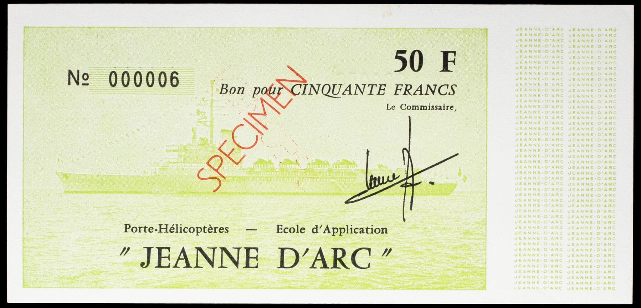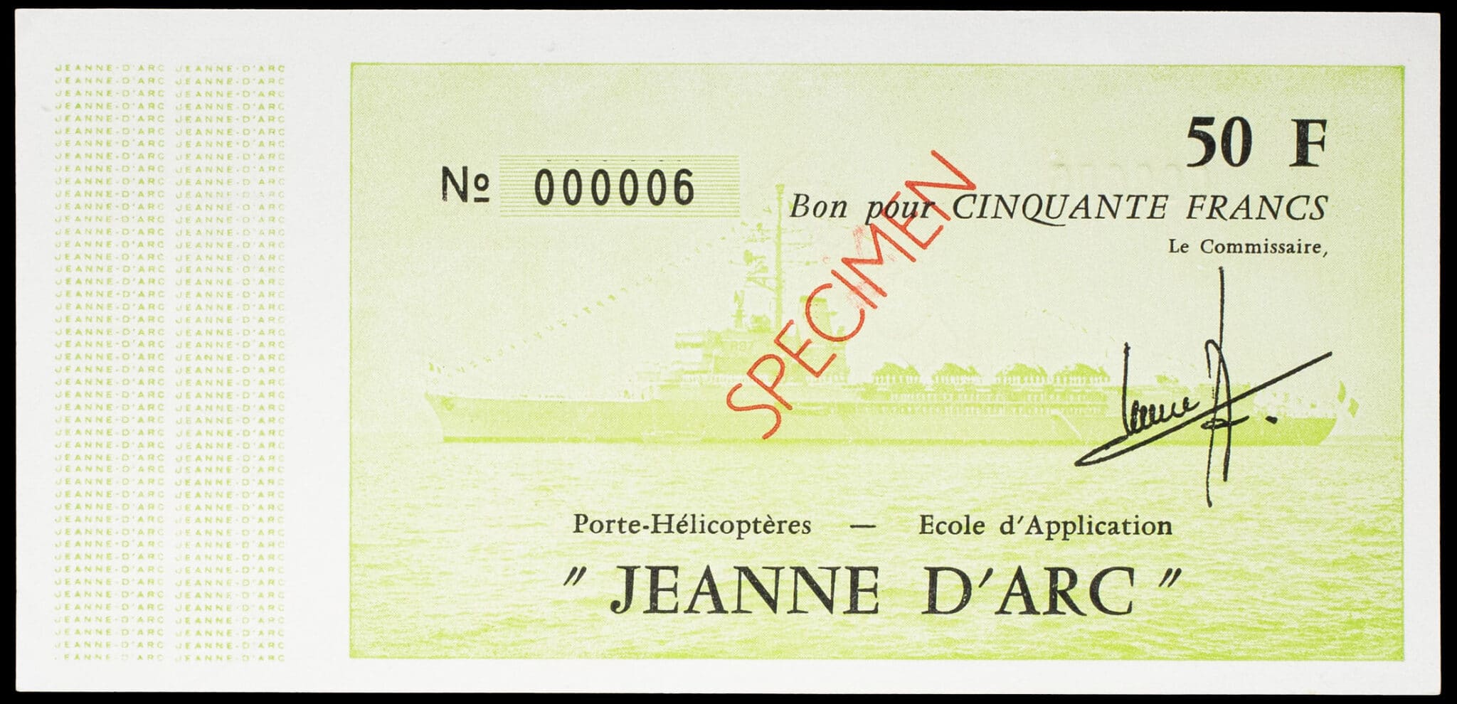 - 50 francs type “Porte-Hélicoptères - École d’Application Jeanne d’Arc” vert SPÉCIMEN avec petit numéro ND (1979-1980).