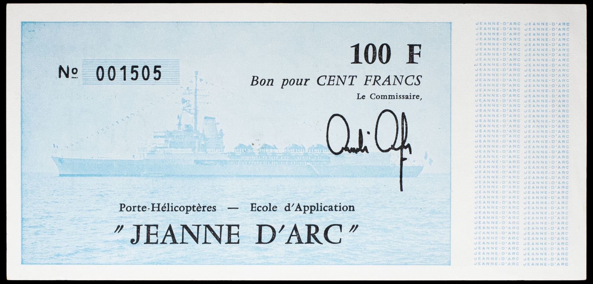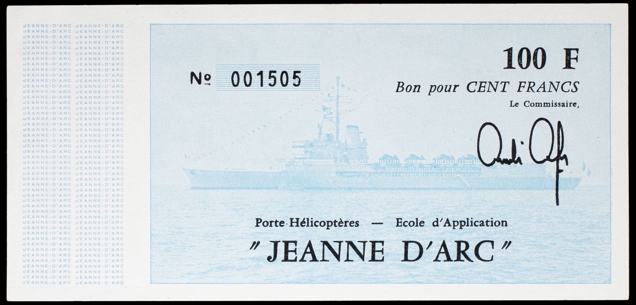 - 100 francs type “Porte-Hélicoptères - École d’Application Jeanne d’Arc” bleu ND (1980-1981).