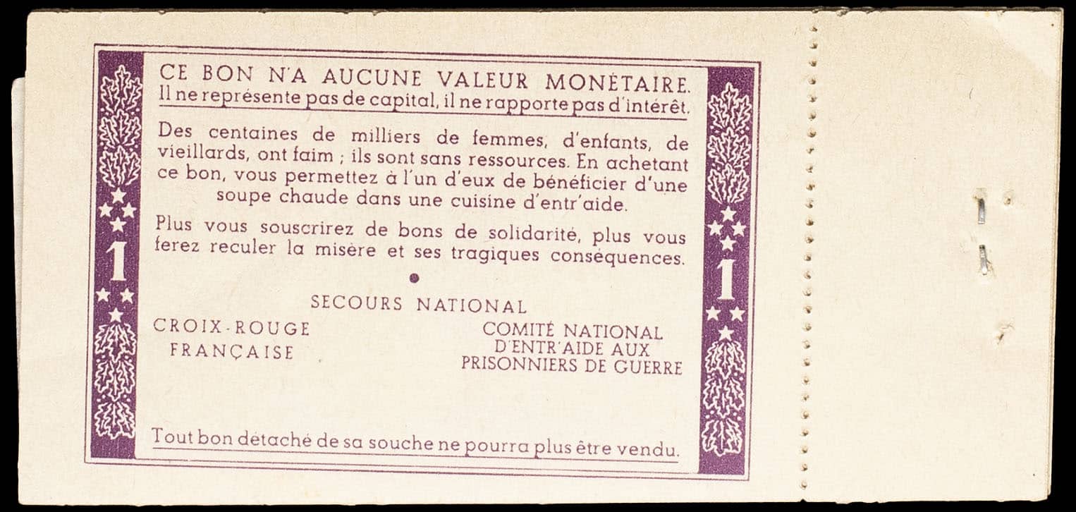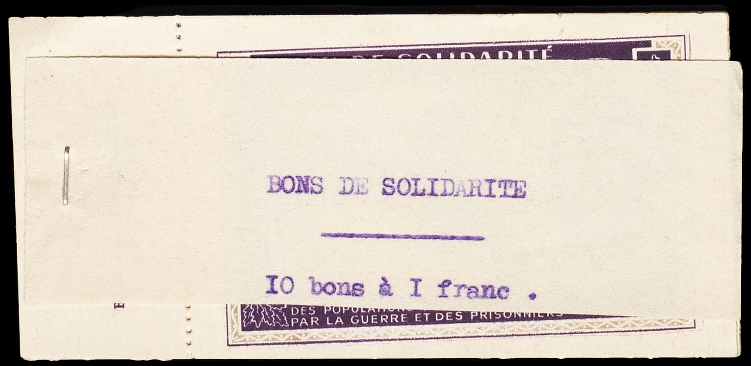 - Carnet de 10 bons de solidarité de 1 franc (var. “Comité national”) ND (1941).