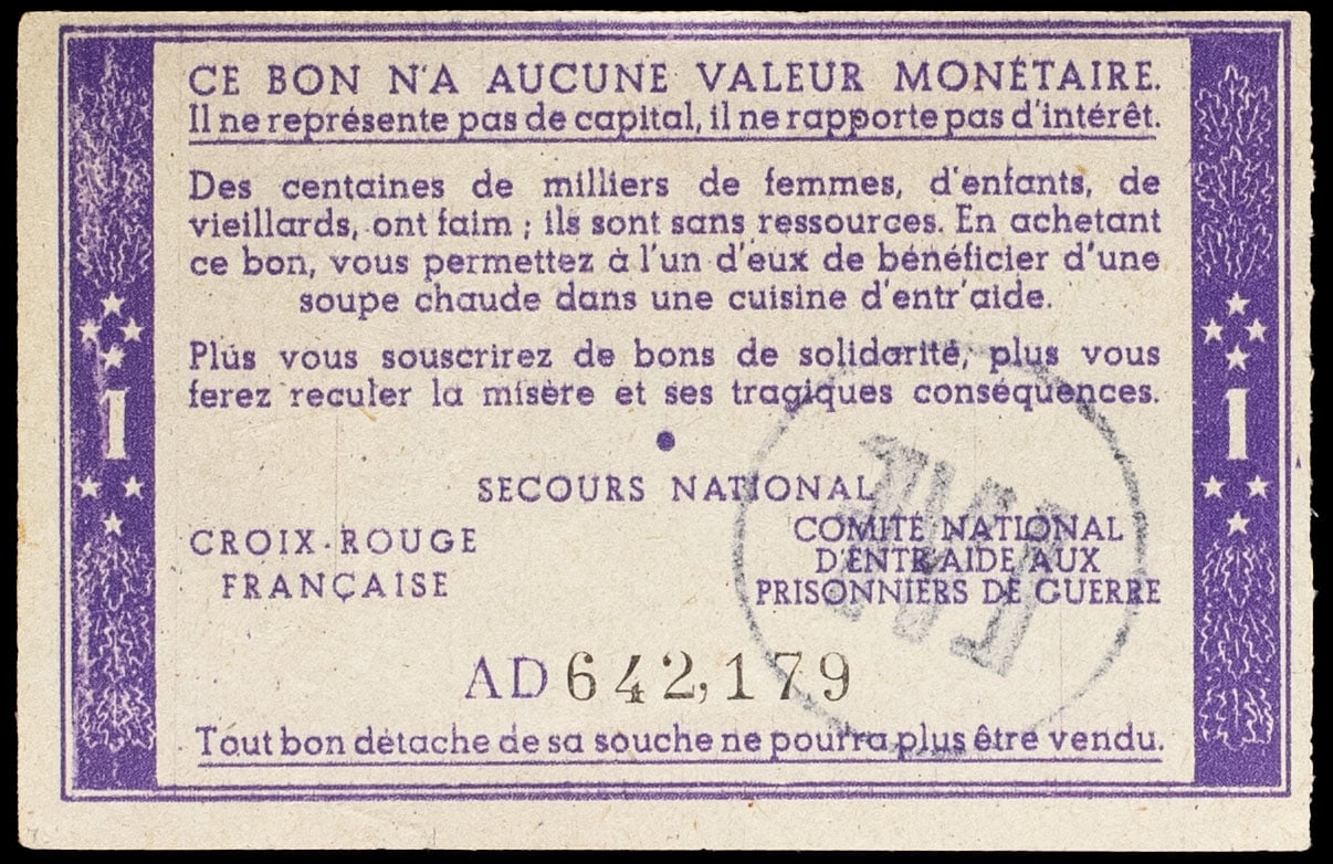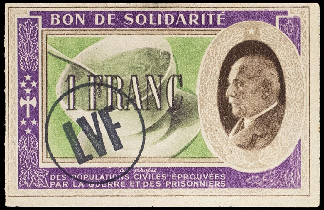 - Bon de solidarité de 1 franc (var. “Comité national”) surchargé “LVF” ND (1941).