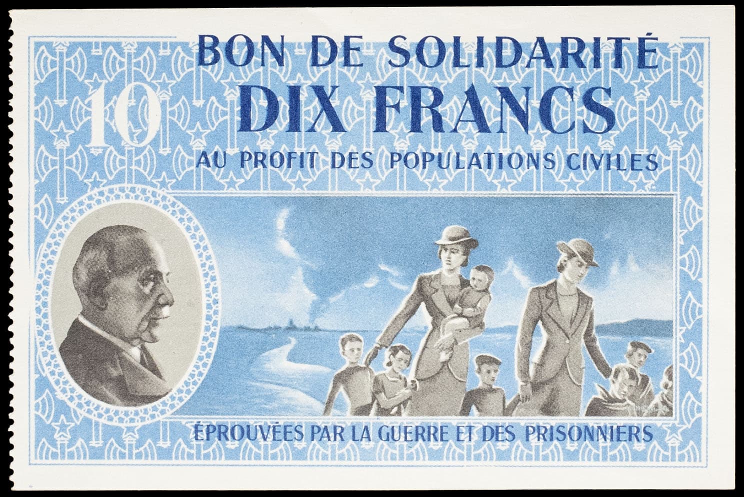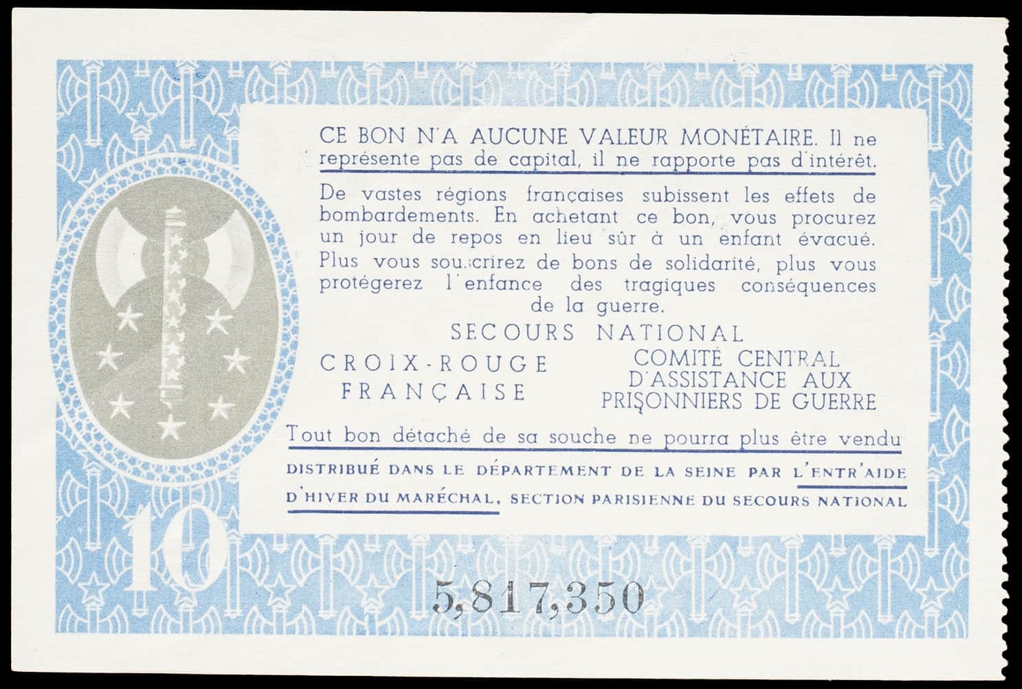 - Bon de solidarité de 10 francs (var. “Comité central”, “Distribué dans le département...”) ND (1941).