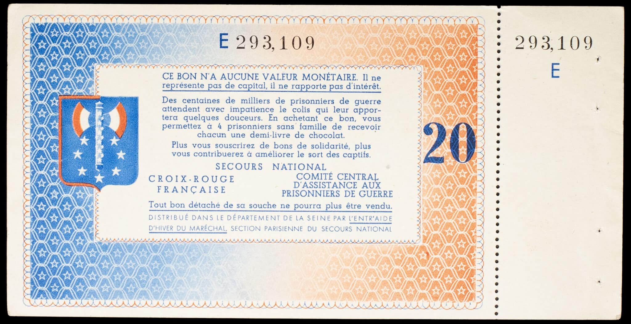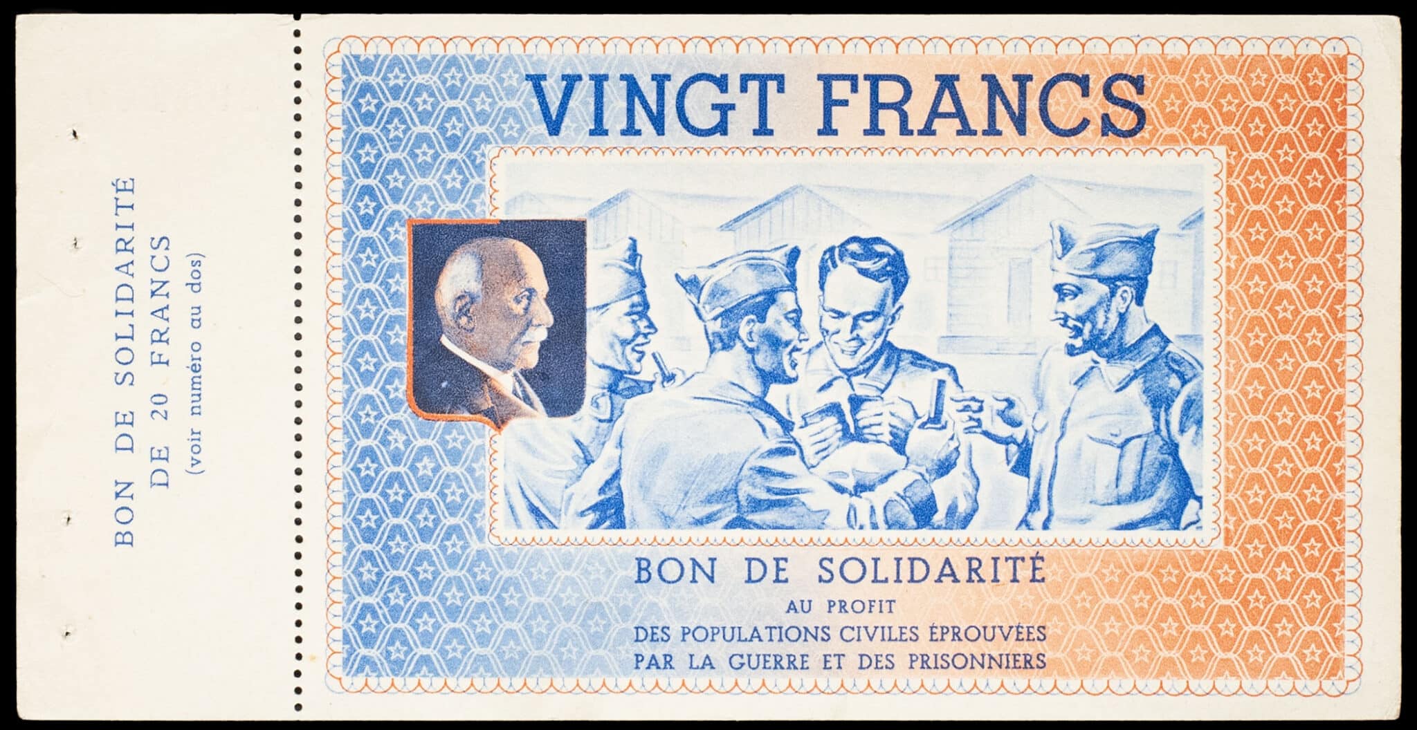 - Bon de solidarité de 20 francs (var. “Comité central”, “Distribué dans le département...”) ND (1941).