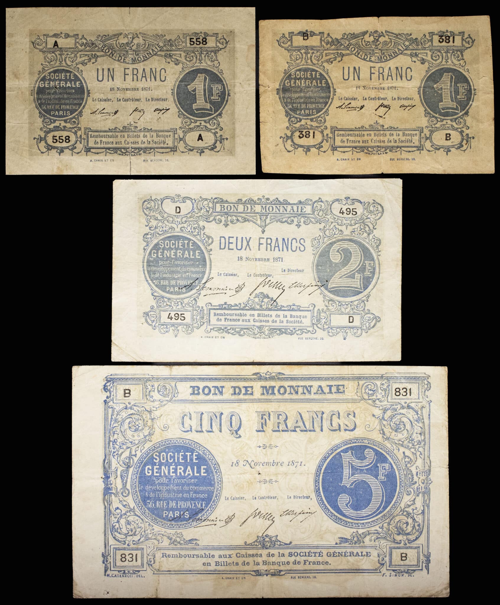 - Lot (4) - Bons de 1 à 5 francs de la Société Générale 18 novembre 1871.