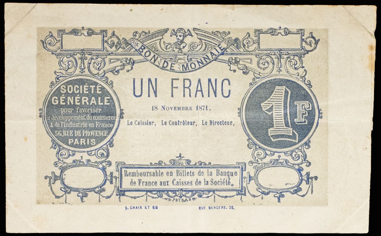 - Bon de 1 franc de la Société Générale non émis 18 novembre 1871.