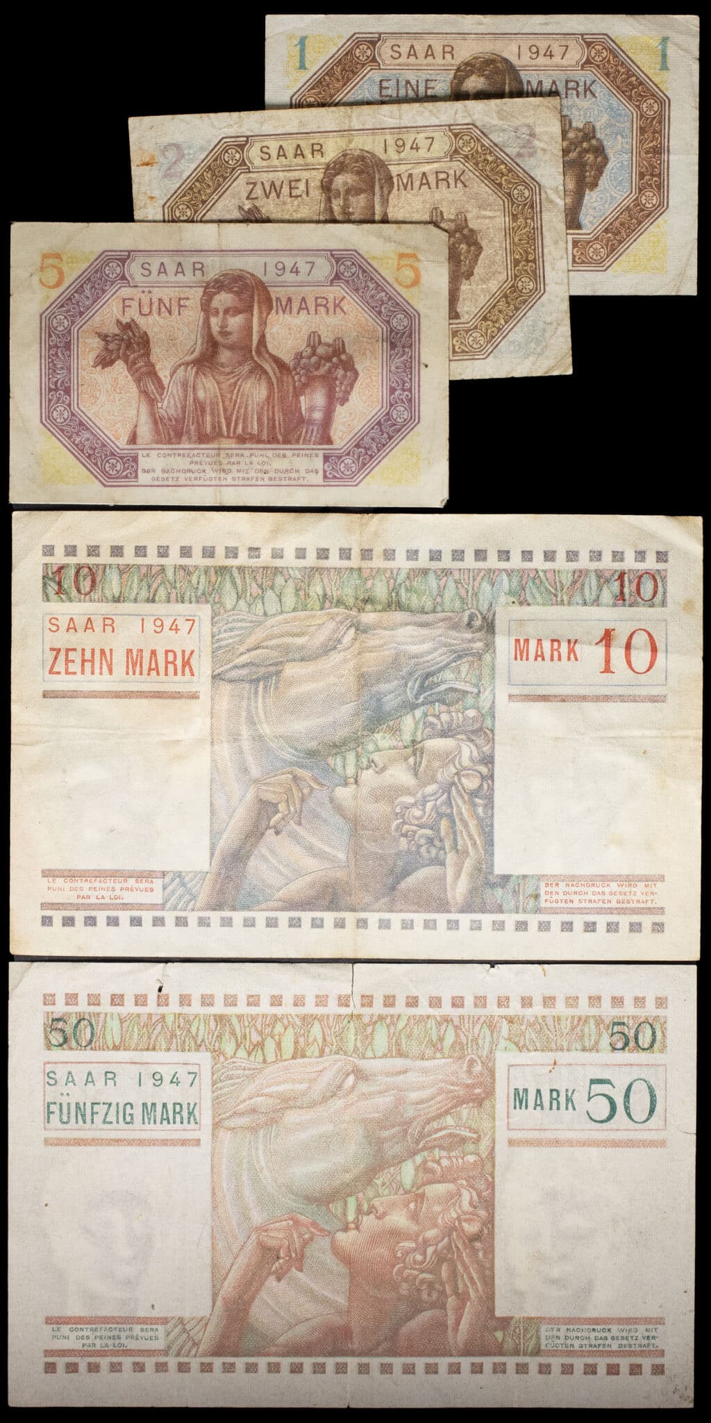 - FRANCE / SAAR PROTECTORATE Lot (5) - 1, 2 et 5 mark type “Zeus”, 10 et 50 mark type “La Paix” 1947.