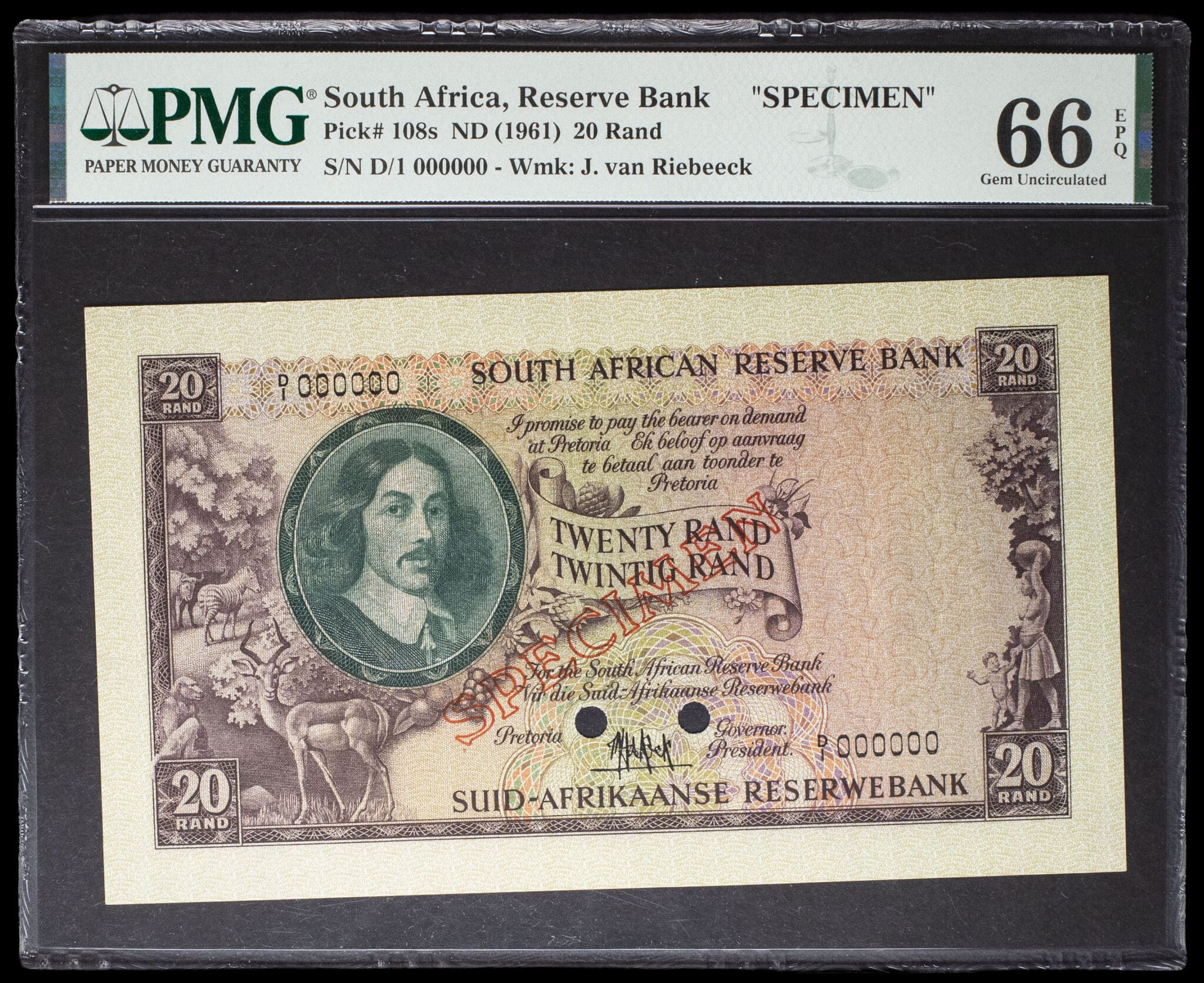 - SOUTH AFRICA 20 rand avec le portrait de Bartholomeus Vermuyden SPÉCIMEN ND (1961).