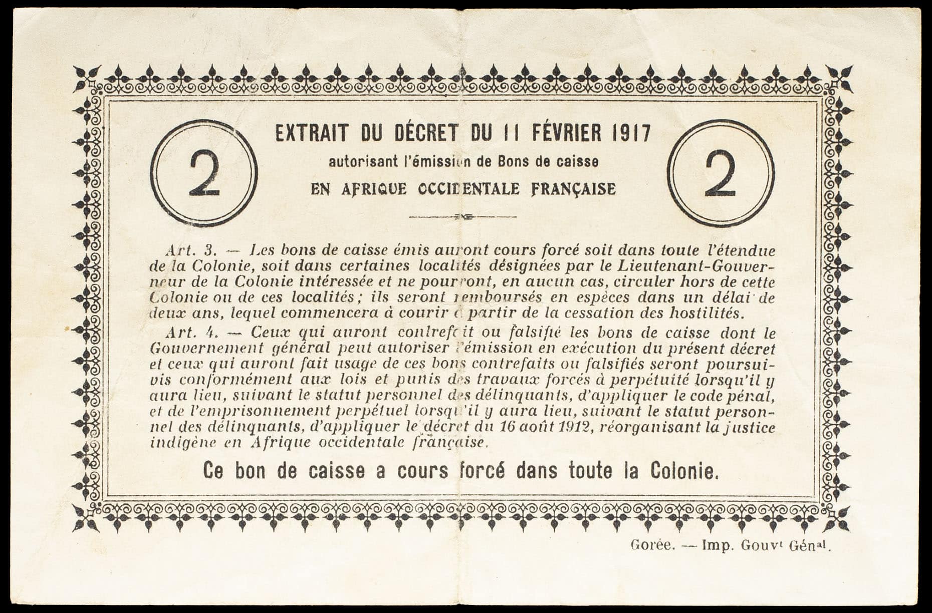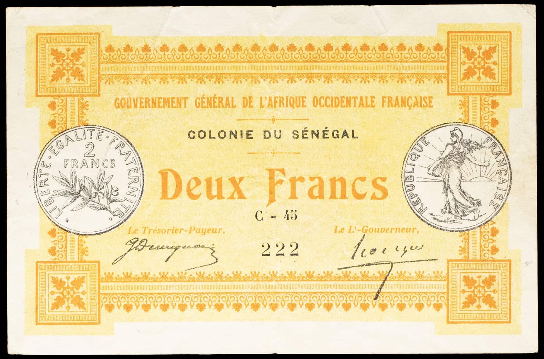 - FRENCH WEST AFRICA 2 francs type “jaune” - Colonie du Sénégal, Gouvernement général de l’Afrique Occidentale Française 11 février 1917.
