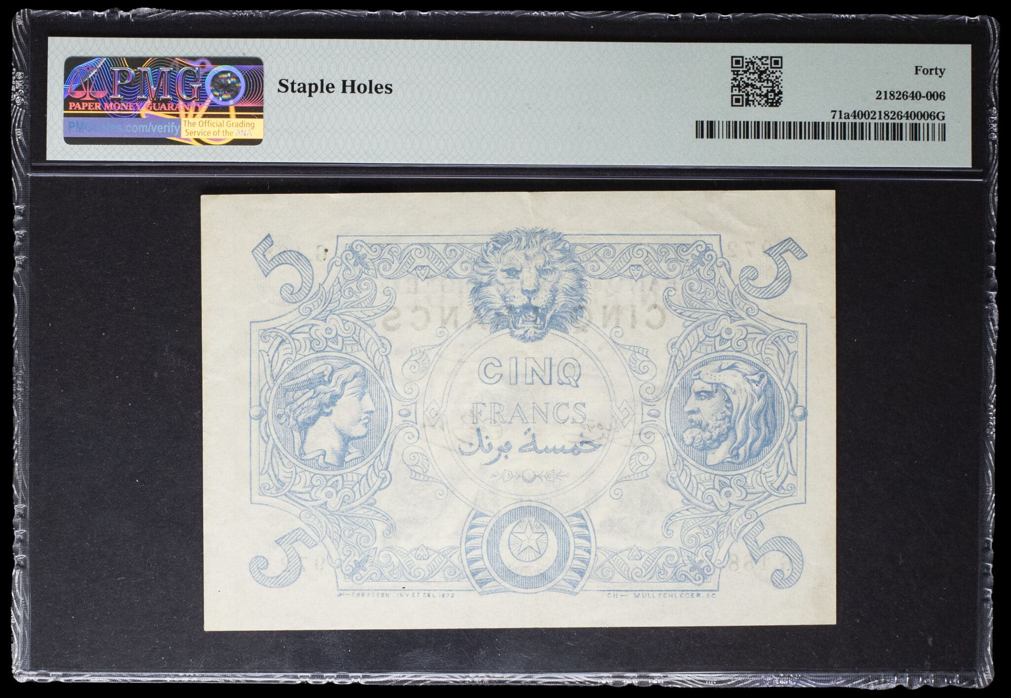 PMG 40 Extremely Fine (2182640-006). Bel exemplaire avec un épinglage (deux trous) et un pli central. Billet frais en couleur, non touché. TTB+.