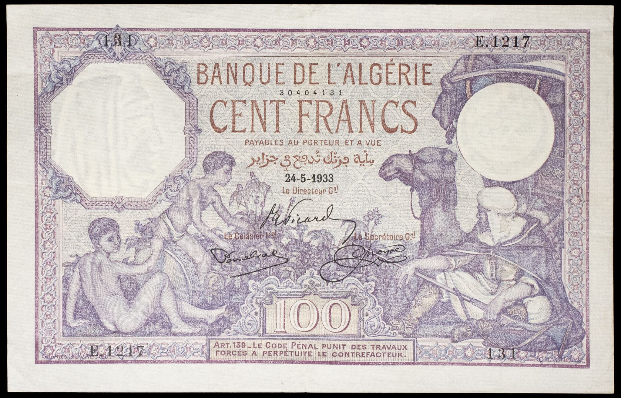 - ALGERIA 100 francs type “violet” 24-5-1933.