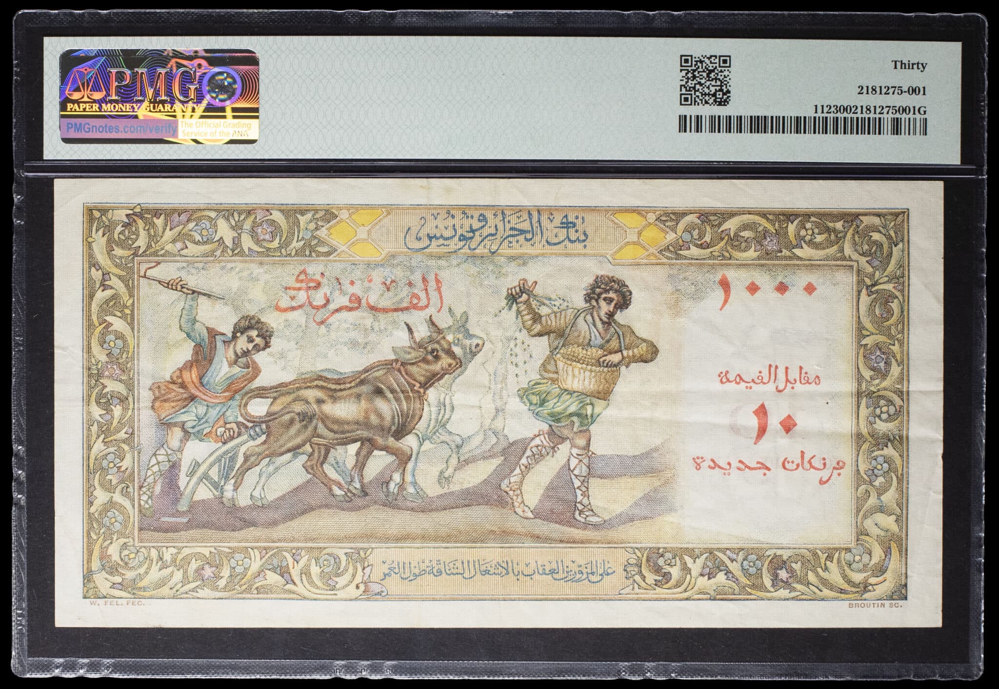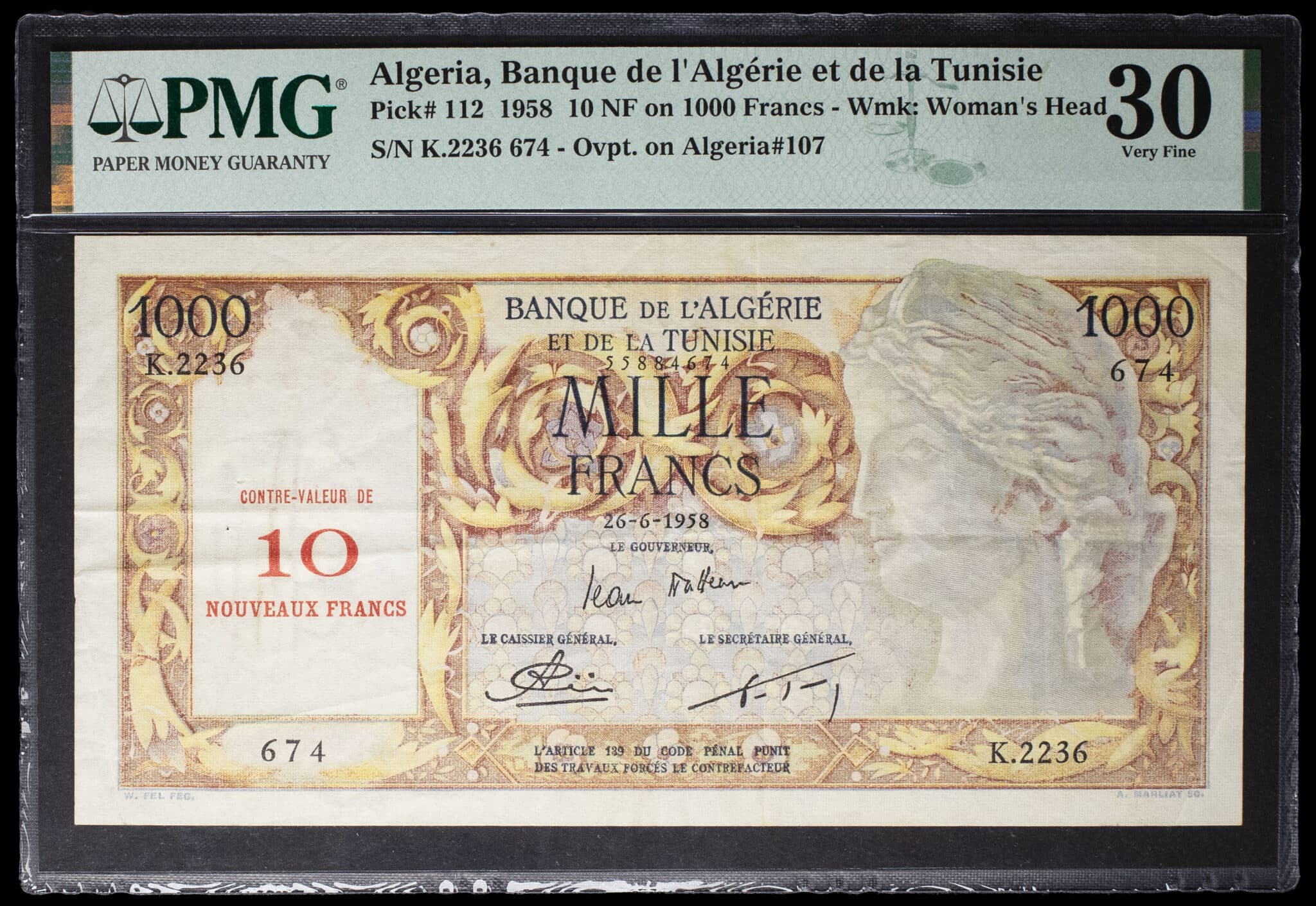 - ALGERIA 10 nouveaux francs surchargé sur 1000 francs type “Isis” 26-6-1958.