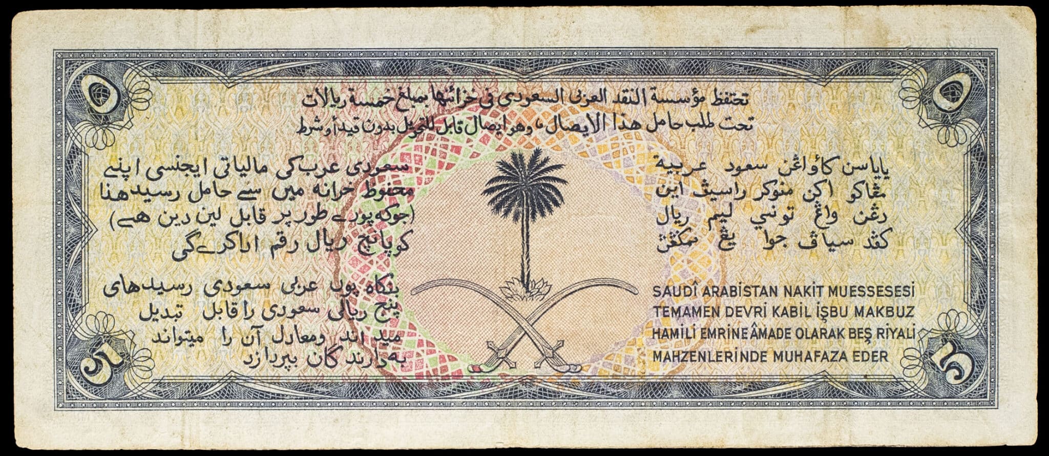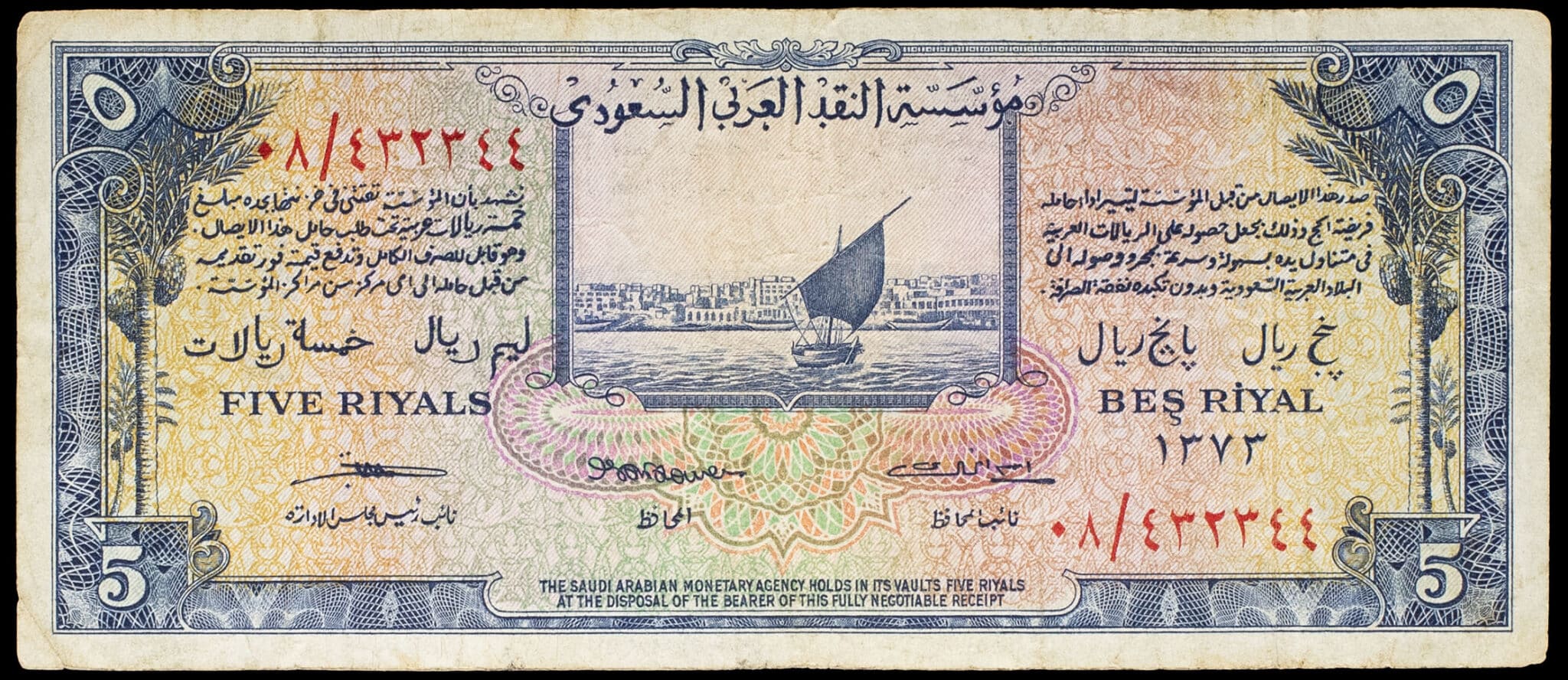 - SAUDI ARABIA 5 riyals ND (1954 / AH 1373).