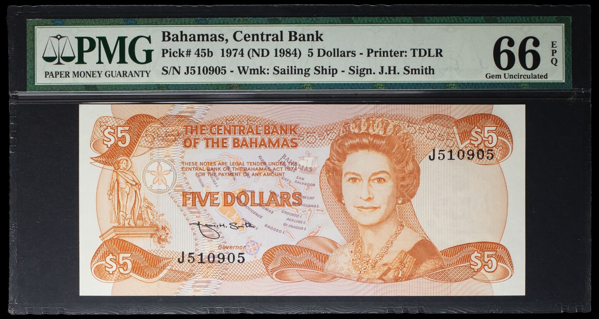 - 5 dollars avec le portrait de la reine Élisabeth (Elizabeth) II ND (1984).