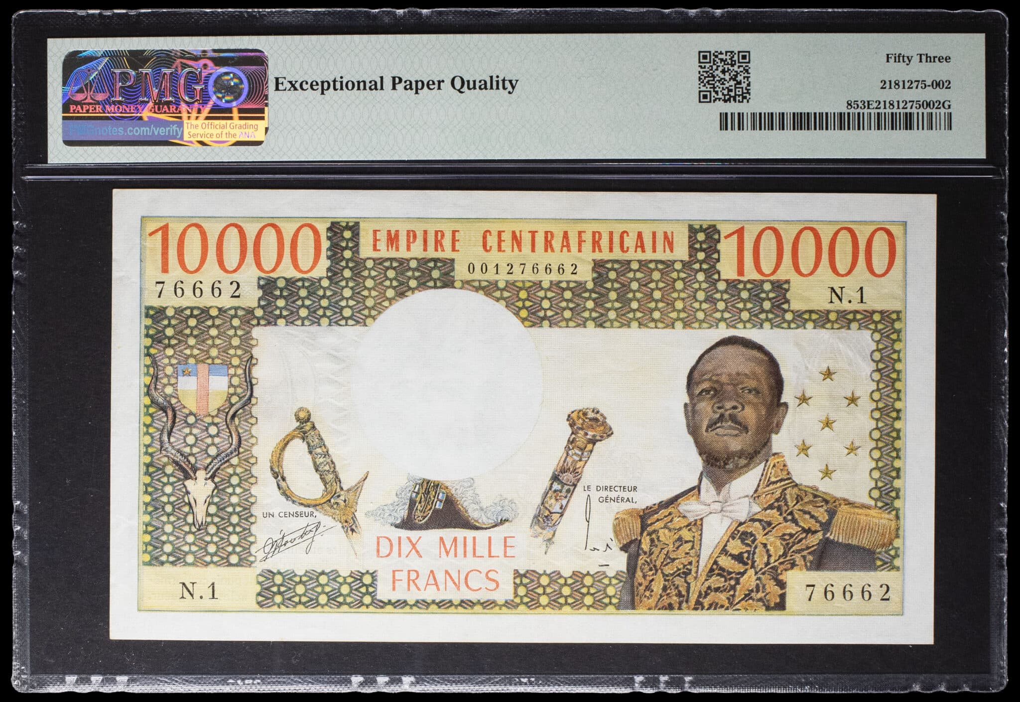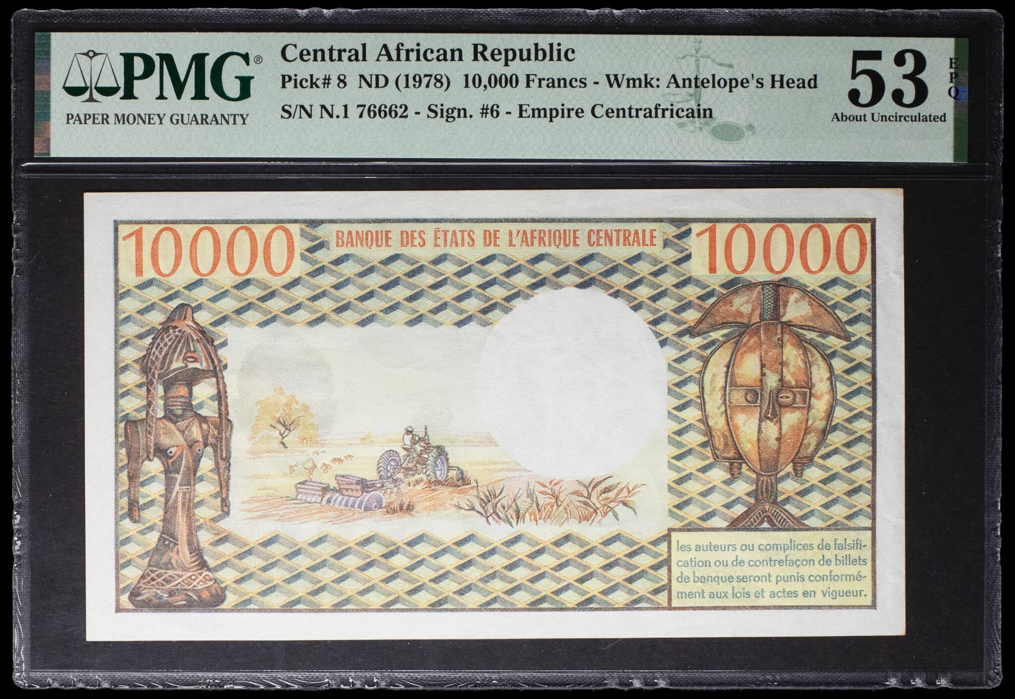 - CENTRAL AFRICAN REPUBLIC 10 000 francs avec le portrait de l’empereur Bokassa en tenue de maréchal ND (1978).