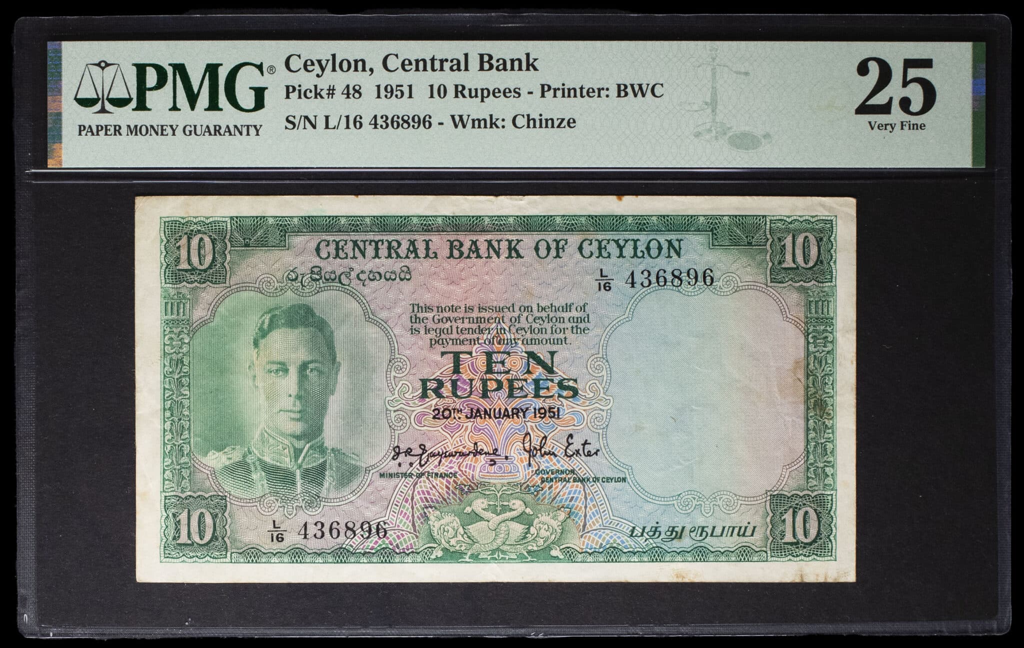- CEYLON 10 rupees avec le portrait du roi George VI 20 janvier 1951.