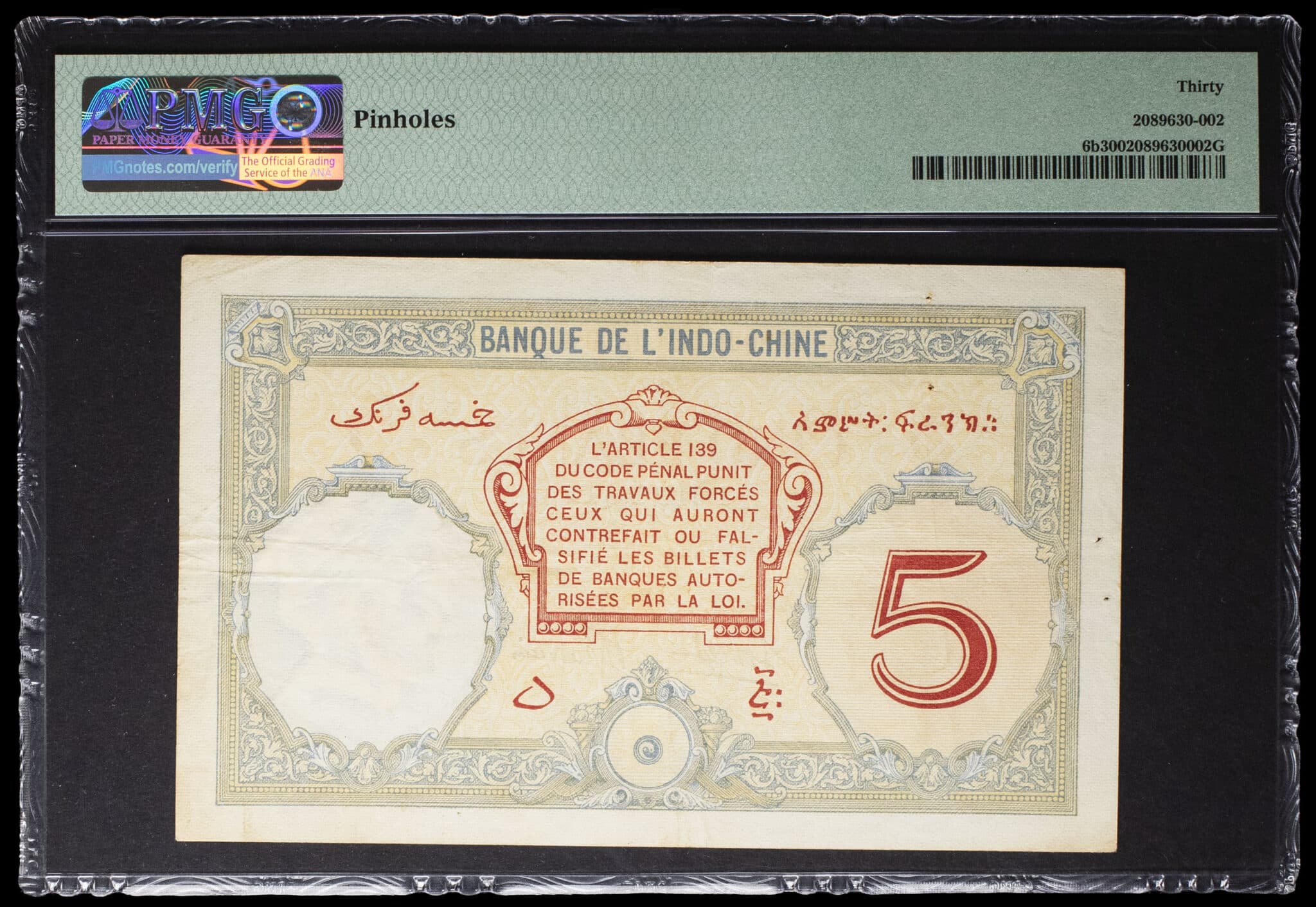 PMG 30 Very Fine (2089630-002). Cinq trous d’épingles, quelques plis et rousseurs. TTB.