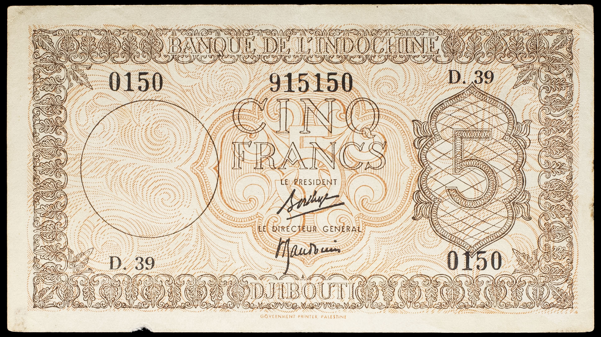- 5 francs, impression Palestine - Banque de l’Indochine ND (1945).
