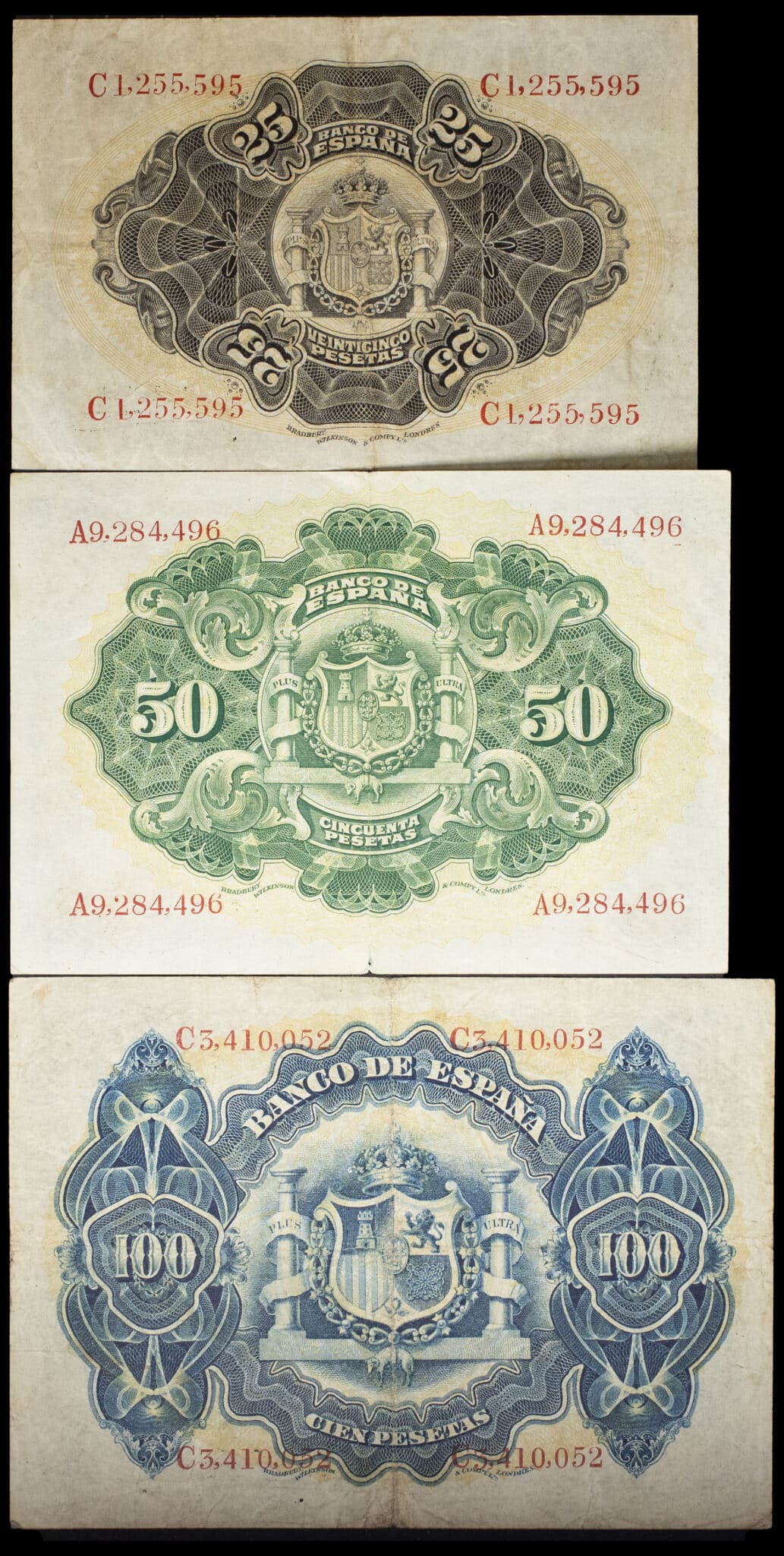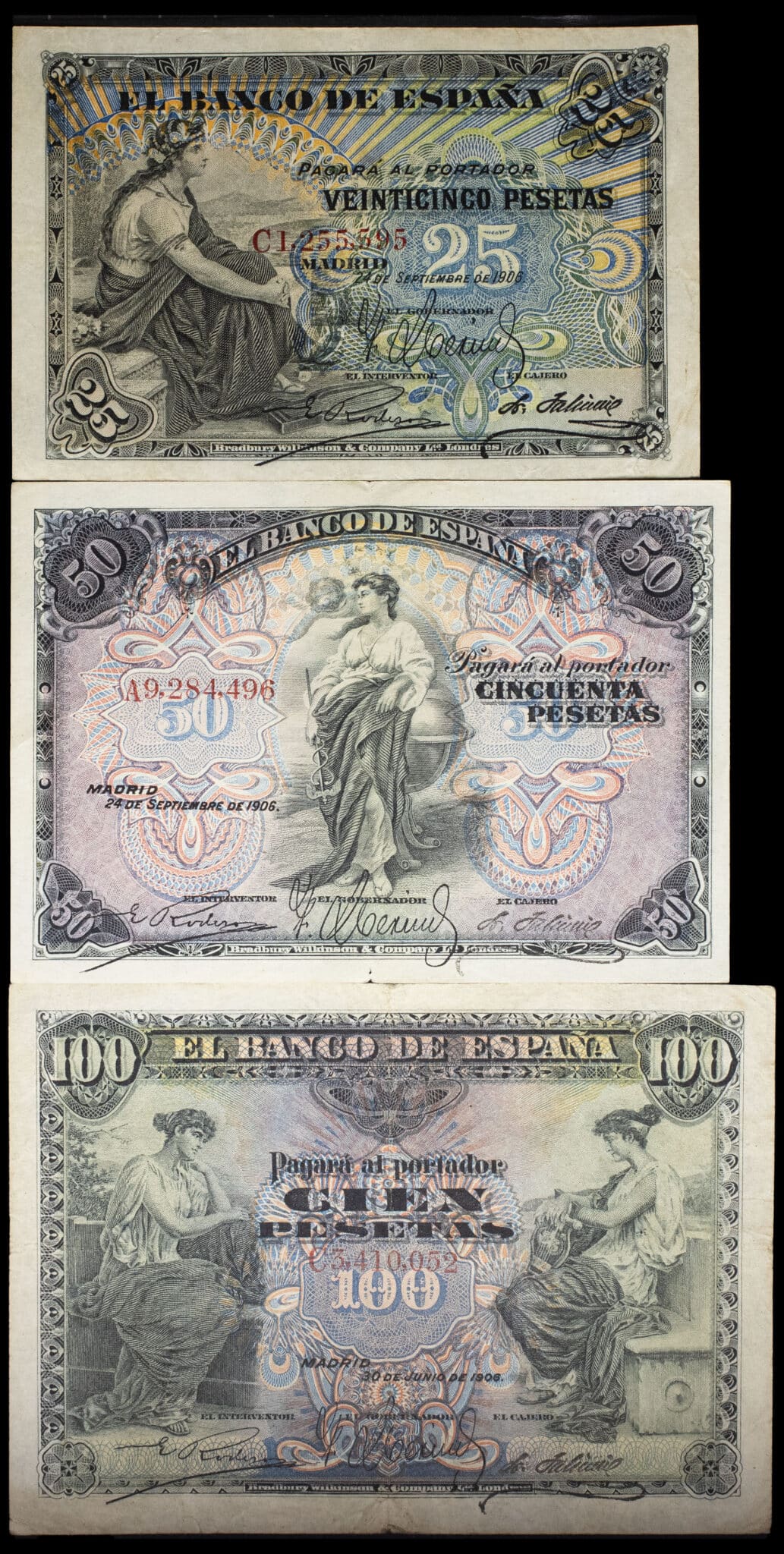 - SPAIN Lot (3) - 25, 50, 100 pesetas 30 juin au 24 septembre 1906.