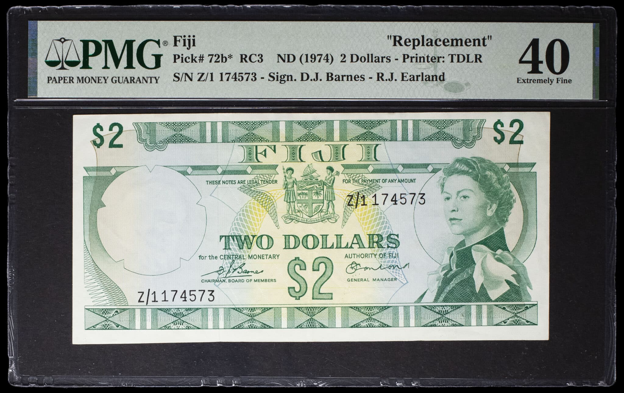 - FIJI 2 dollars avec le portrait de la reine Élisabeth (Elizabeth) II ND (1974).