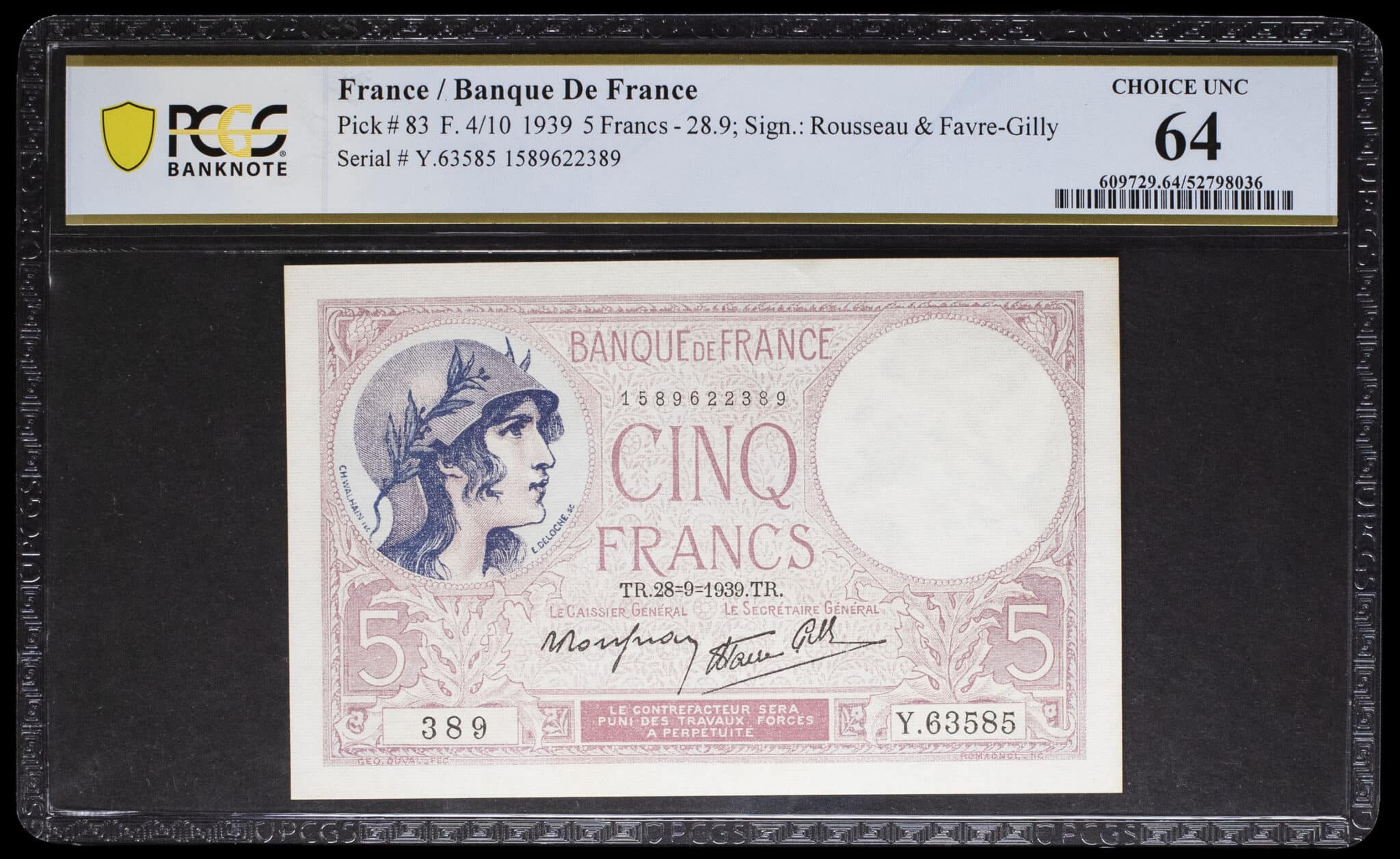 - 5 francs type “femme casquée” dit “violet” modifié 28-9-1939.