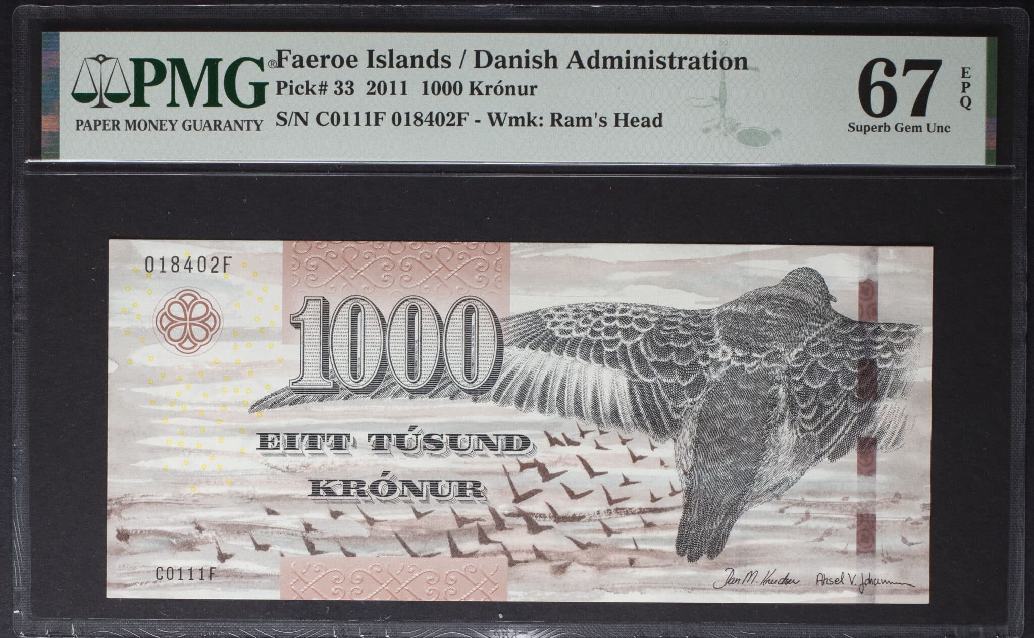 - FAROE ISLANDS 1000 krónur type “bécasseau violet” 2011.