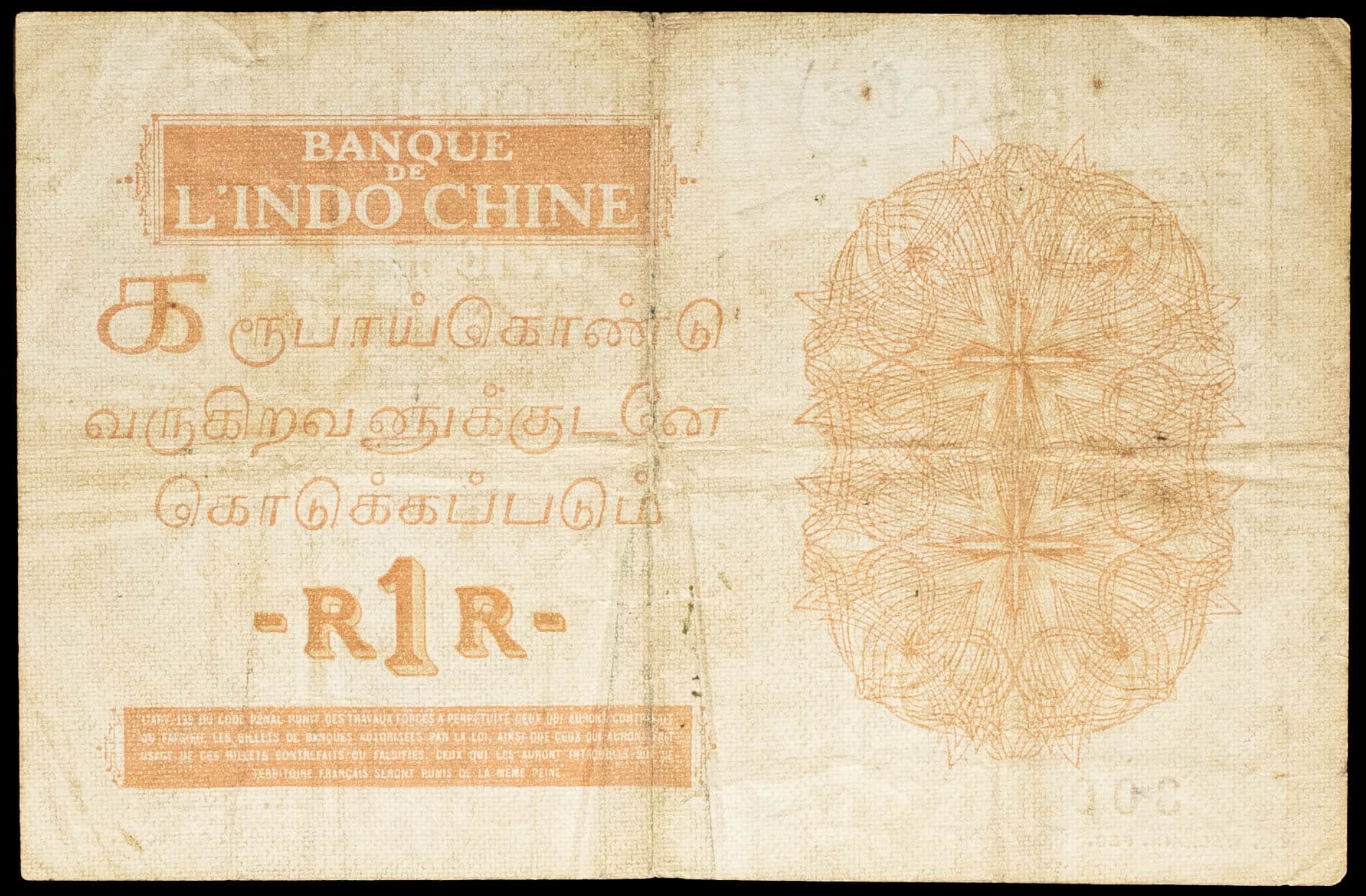 - FRENCH INDIES 1 roupie / 1 rupee type “Walhain” modifié - Pondichéry, Banque de l’Indochine 8 septembre 1945.