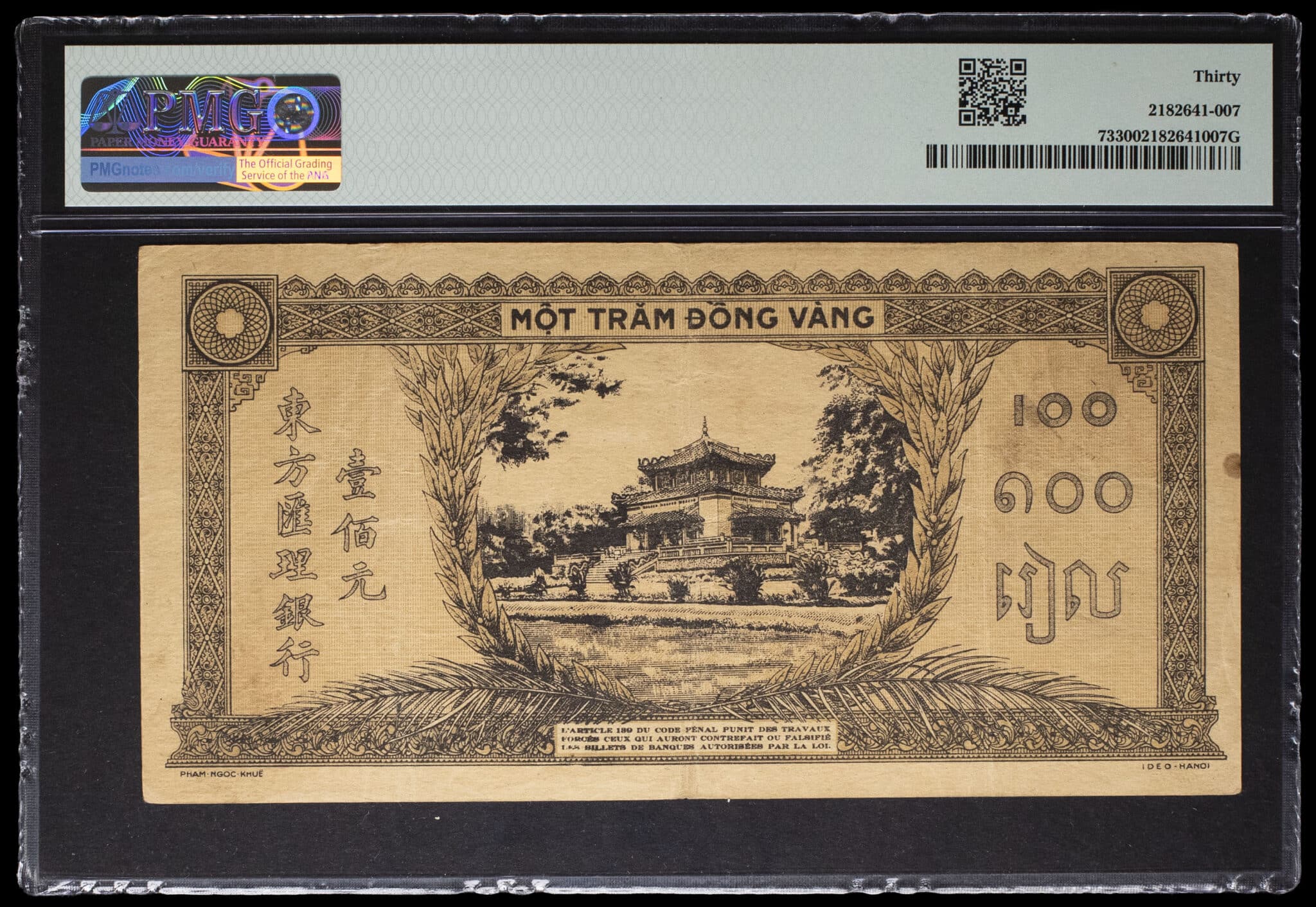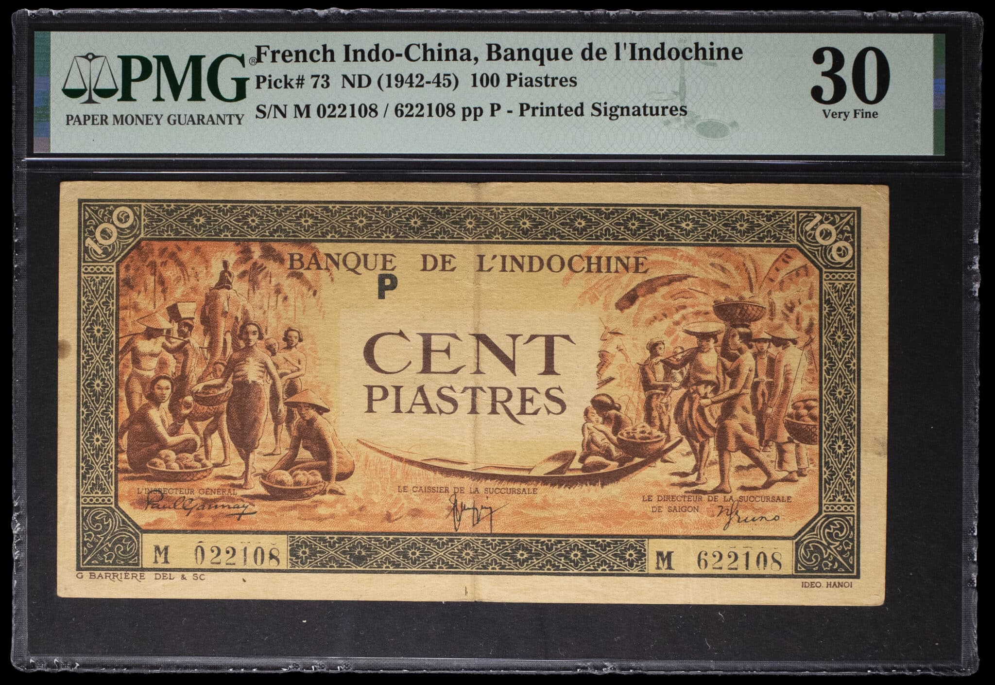 - FRENCH INDOCHINA 100 piastres impression I.D.E.O. type “sépia” ND (1945).