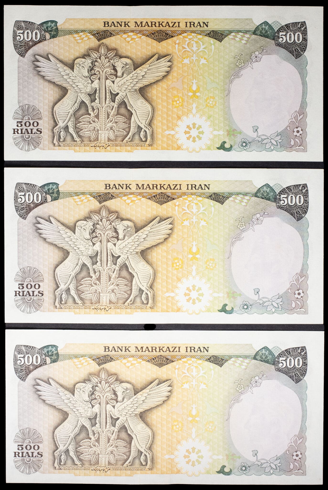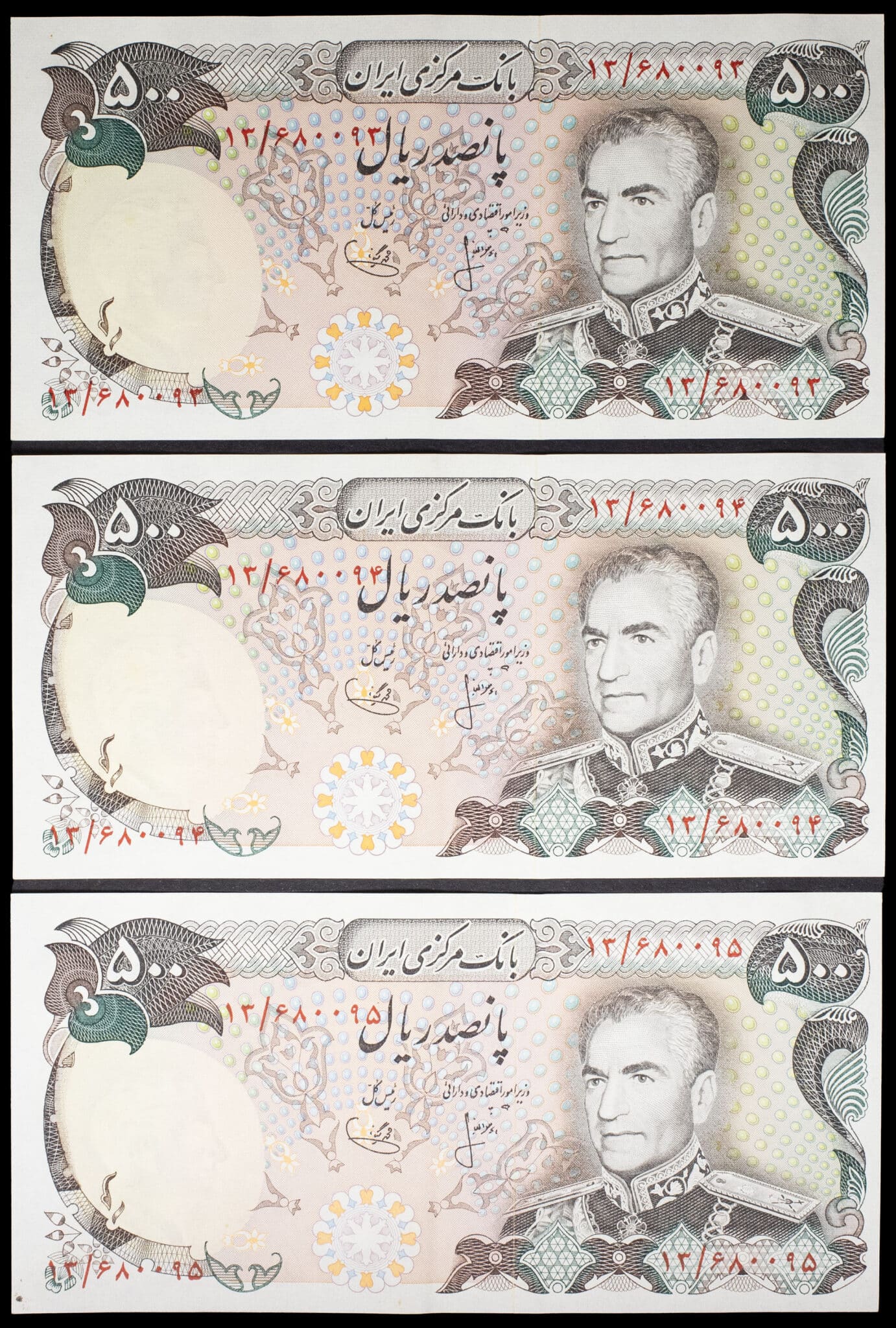 - Lot (3) - 500 rials avec le portrait de Mohammad Reza Pahlavi, avec numéros consécutifs 1974.