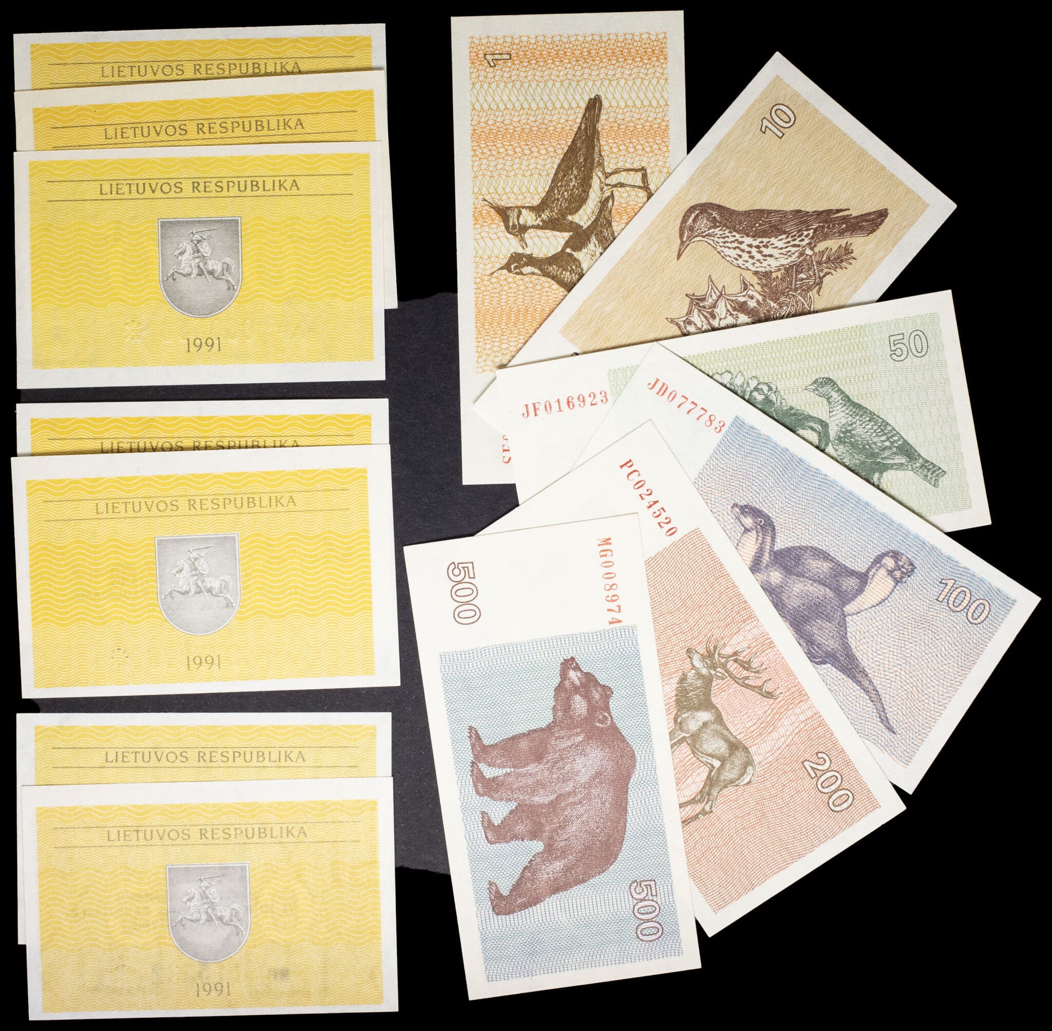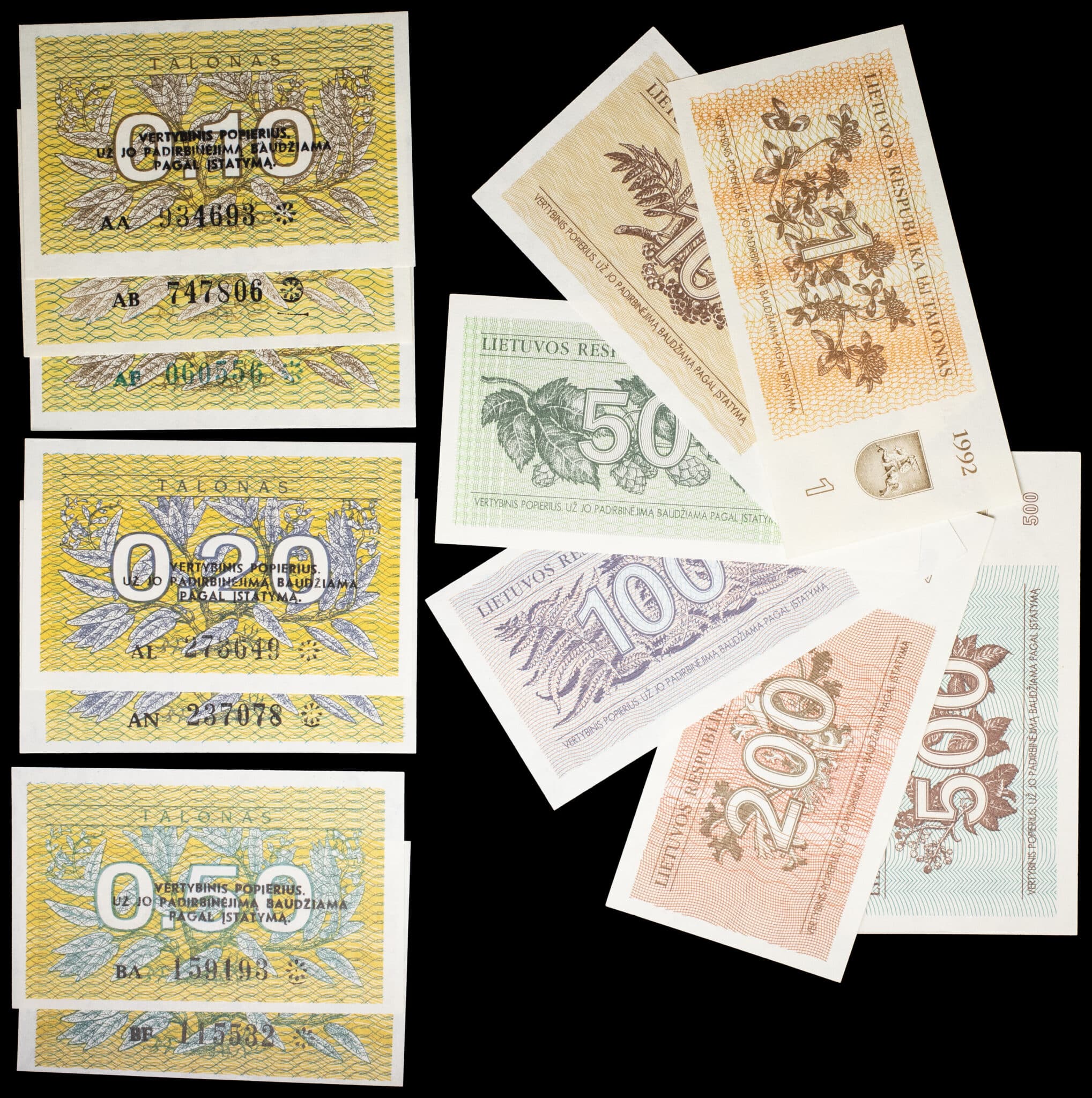 - LITHUANIA Lot (13) - 3x 0,10, 2x 0,20 et 3x 0,50 talonas ; série complète de 1, 10, 50, 100, 200 et 500 talonas 1991-1992.