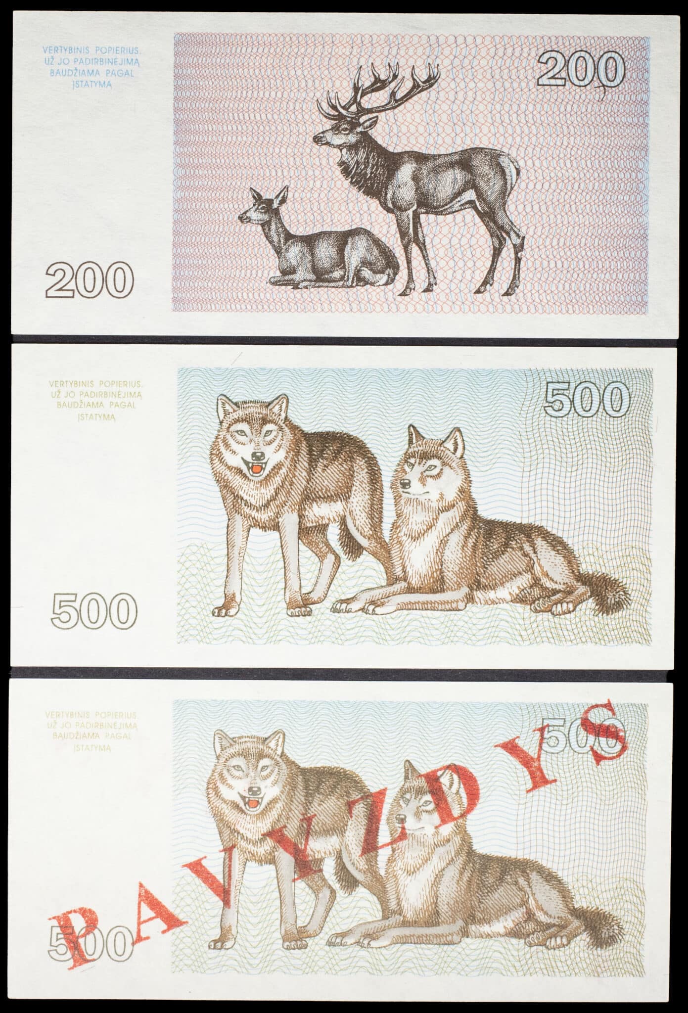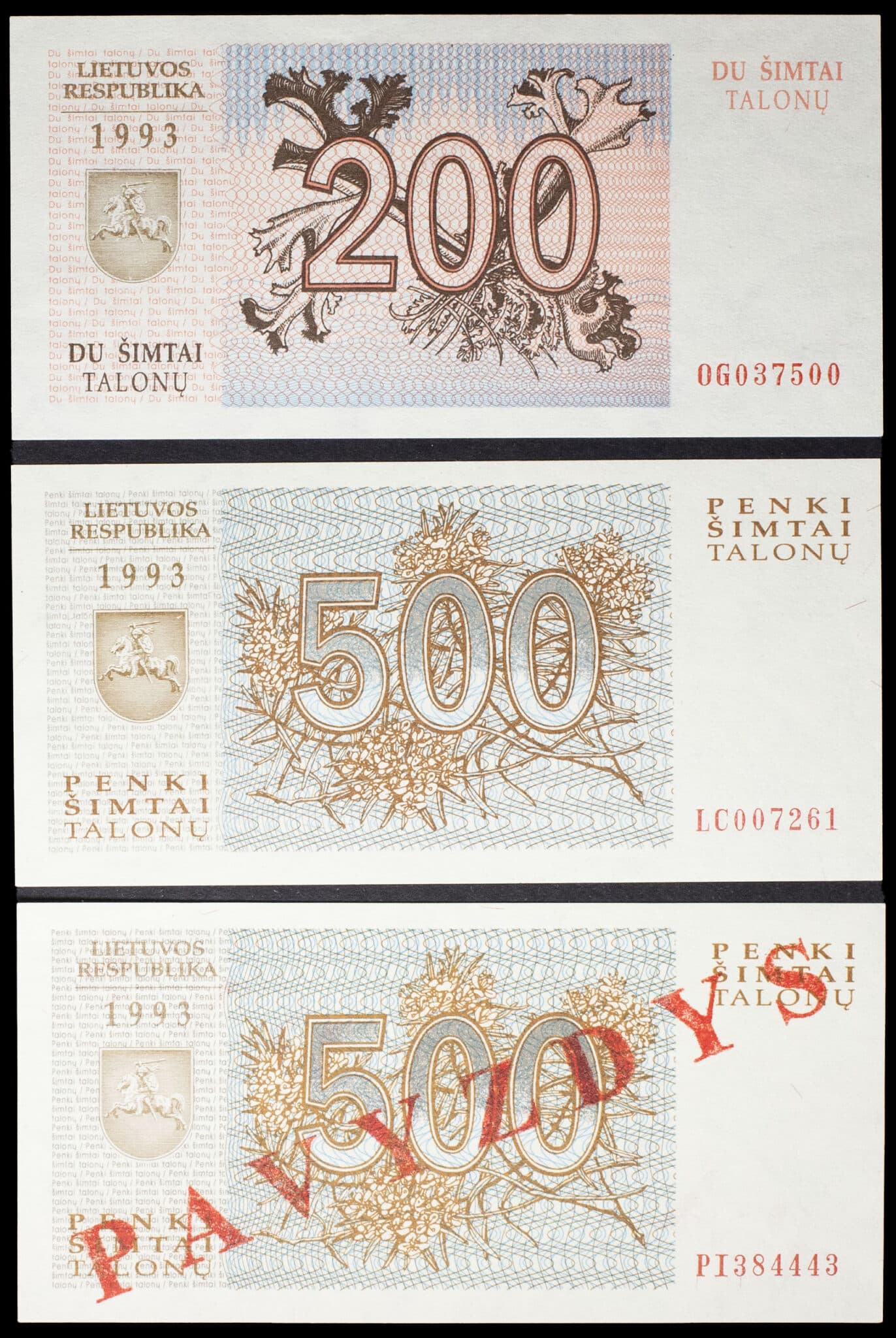 - LITHUANIA Lot (3) - 200 talonas et 500 talonas, 500 talonas (SPÉCIMEN) 1993.