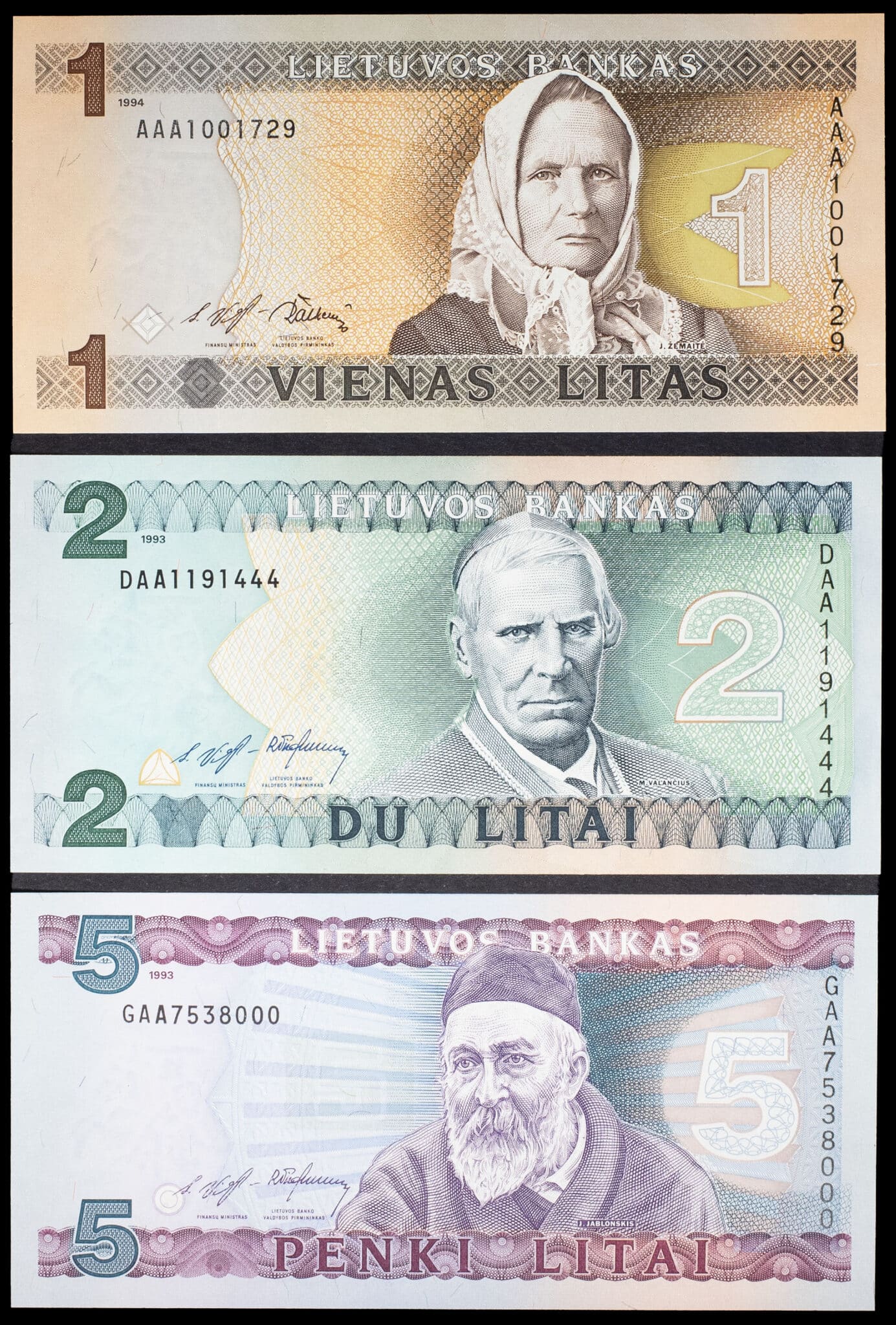 - LITHUANIA Lot (3) - 1 litas type “Julija Žemaitė”, 2 litai type “Motiejus Valančius” et 5 litas “Jonas Jablonskis” 1993-1994.