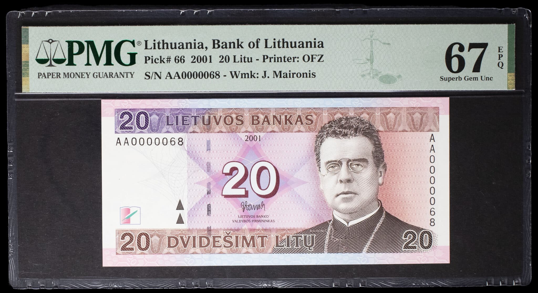 Alphabet AA - numéro 000068. C’est le 68e billet émis ! Notons que le lot précédent (10 litų) possède le même petit numéro, pouvant constituer une paire exceptionnelle !