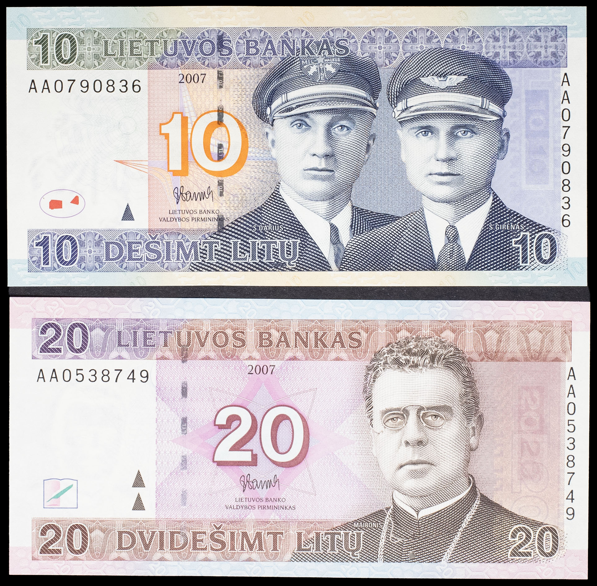 - LITHUANIA Lot (2) - 10 litų type “Steponas Darius et Stasys Girėnas” et 20 litų type “Jonas Maironis” modifiés 2007.