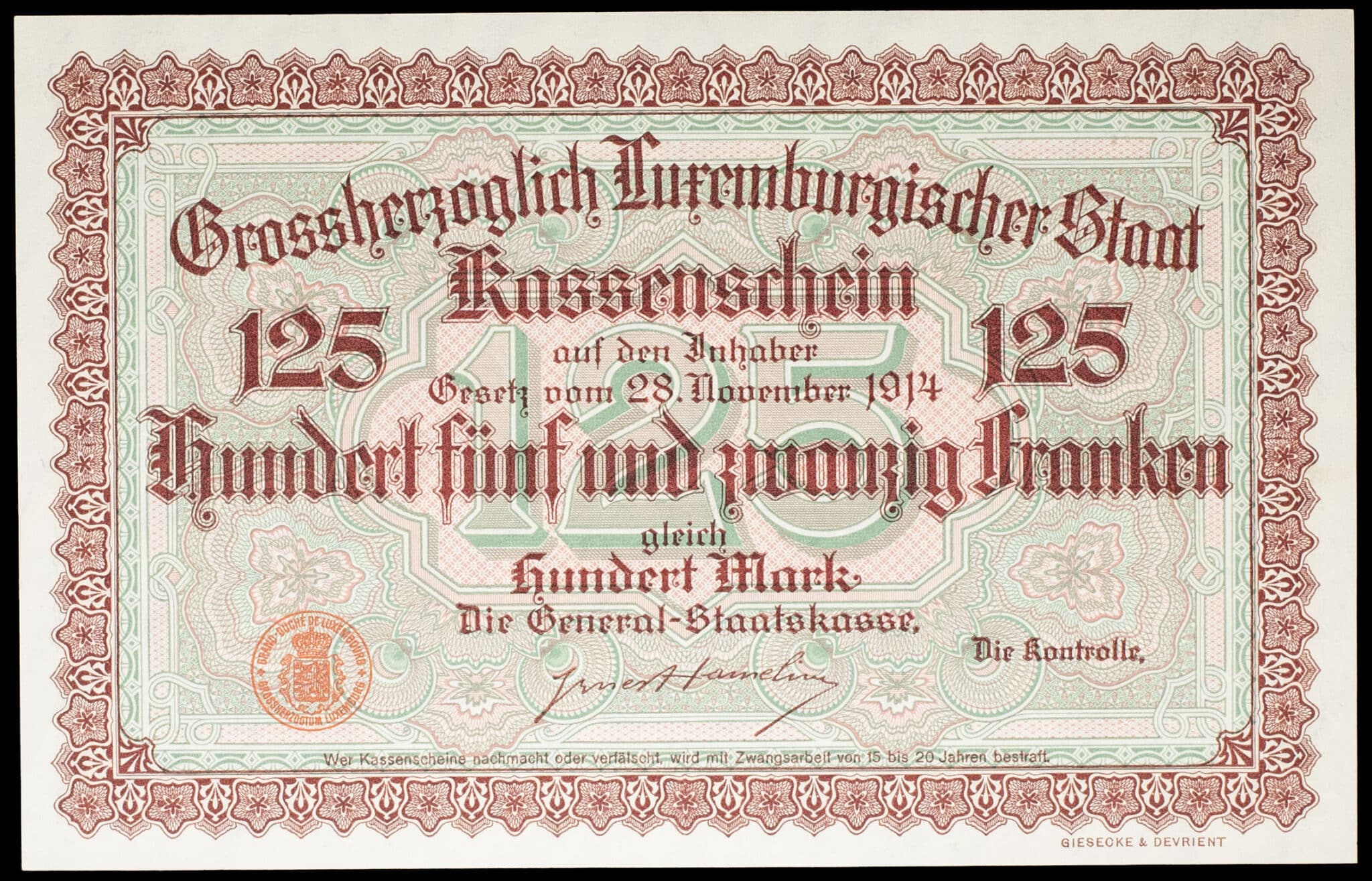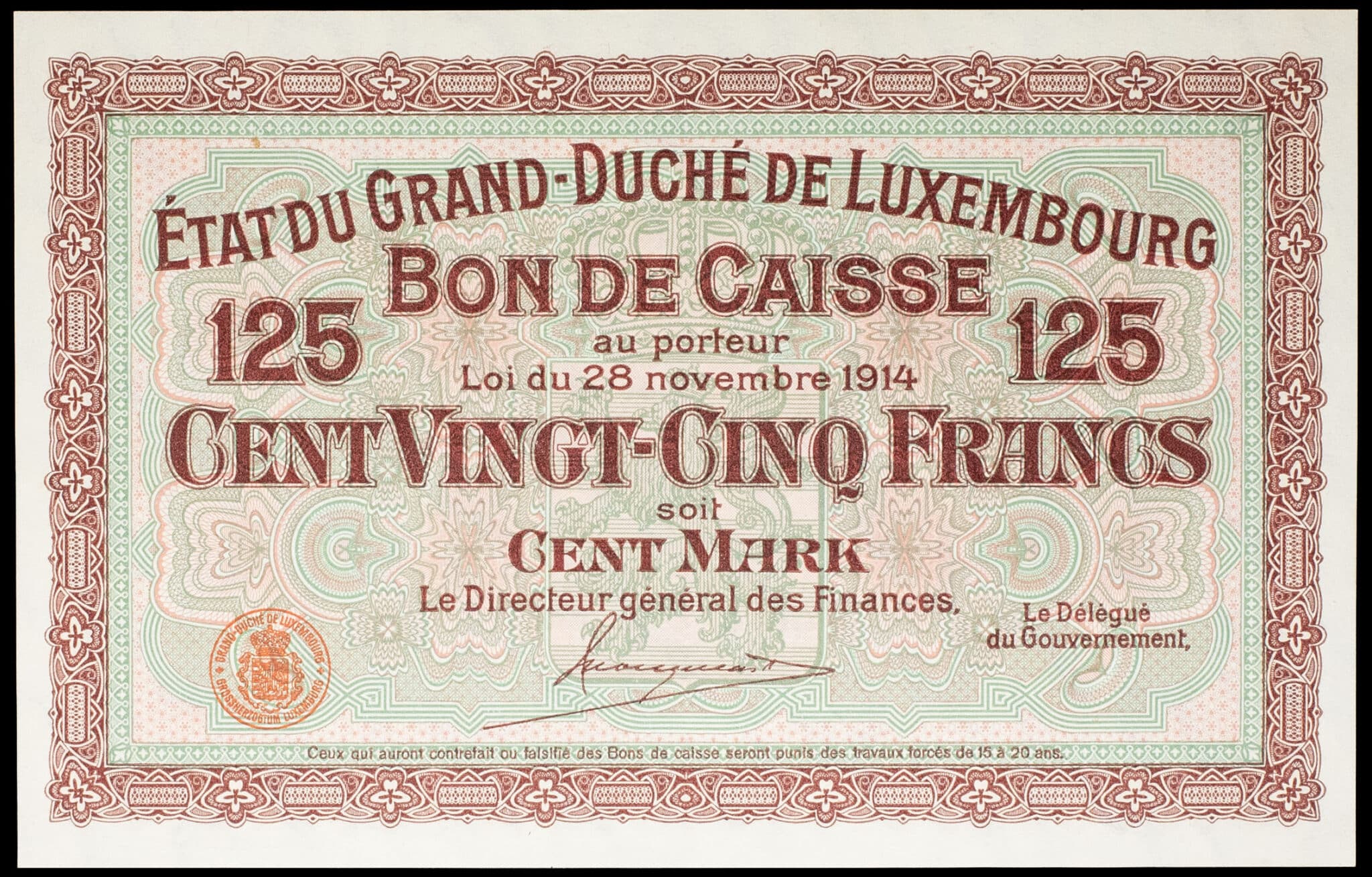 - Bon de caisse 125 francs / 100 mark non émis (Remainder) 28 novembre 1914.