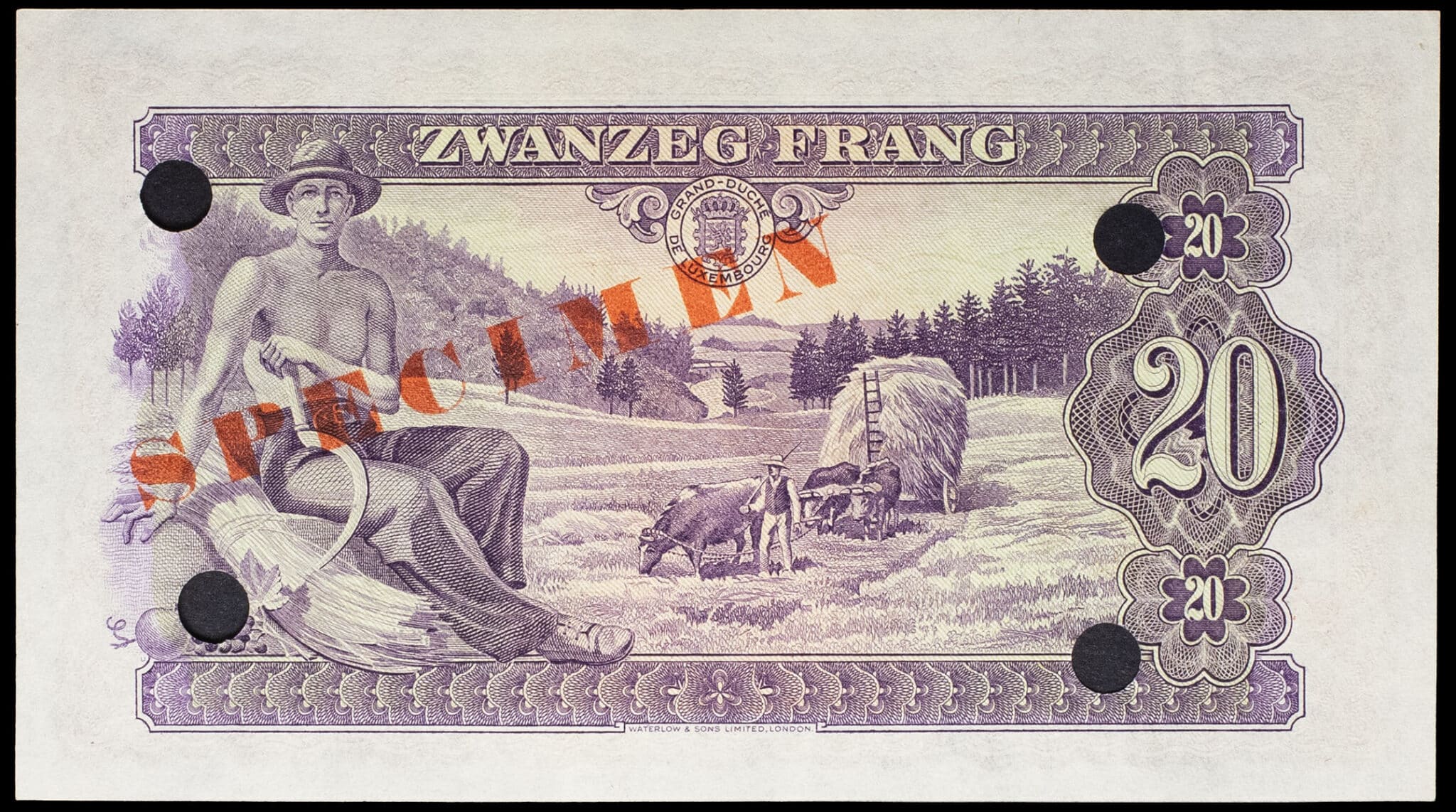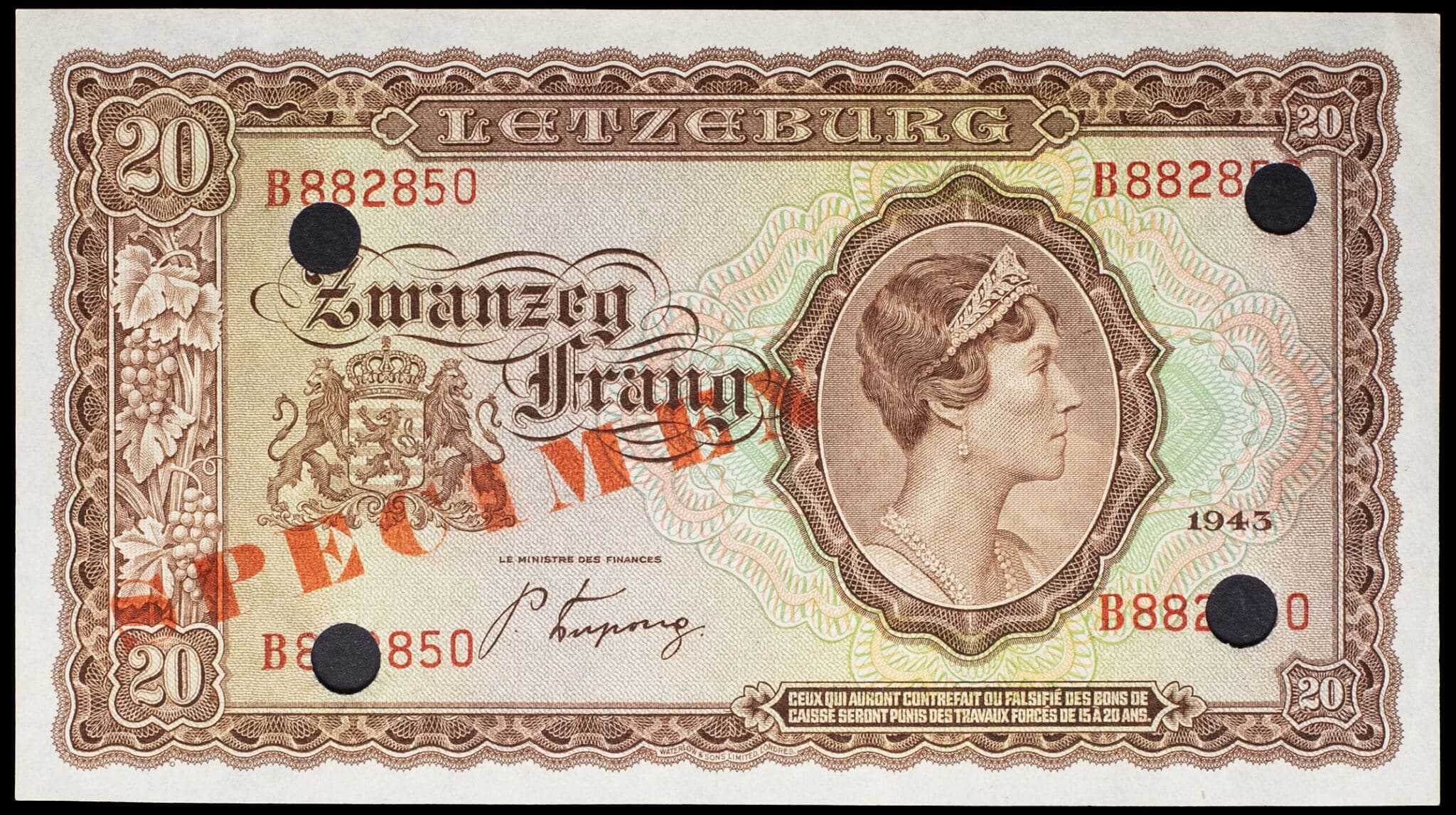 - 20 francs avec le portrait de la grande-duchesse Charlotte (SPÉCIMEN) 1943.