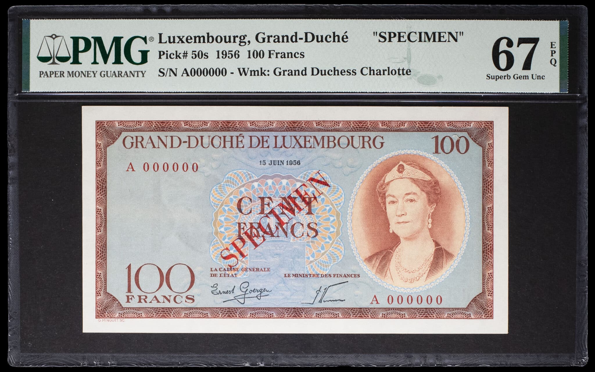 - 100 francs avec le portrait de la grande-duchesse Charlotte (SPÉCIMEN) 15 juin 1956.