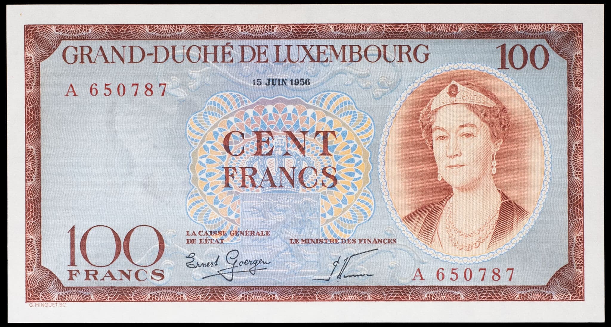 - 100 francs avec le portrait de la grande-duchesse Charlotte 15 juin 1956.