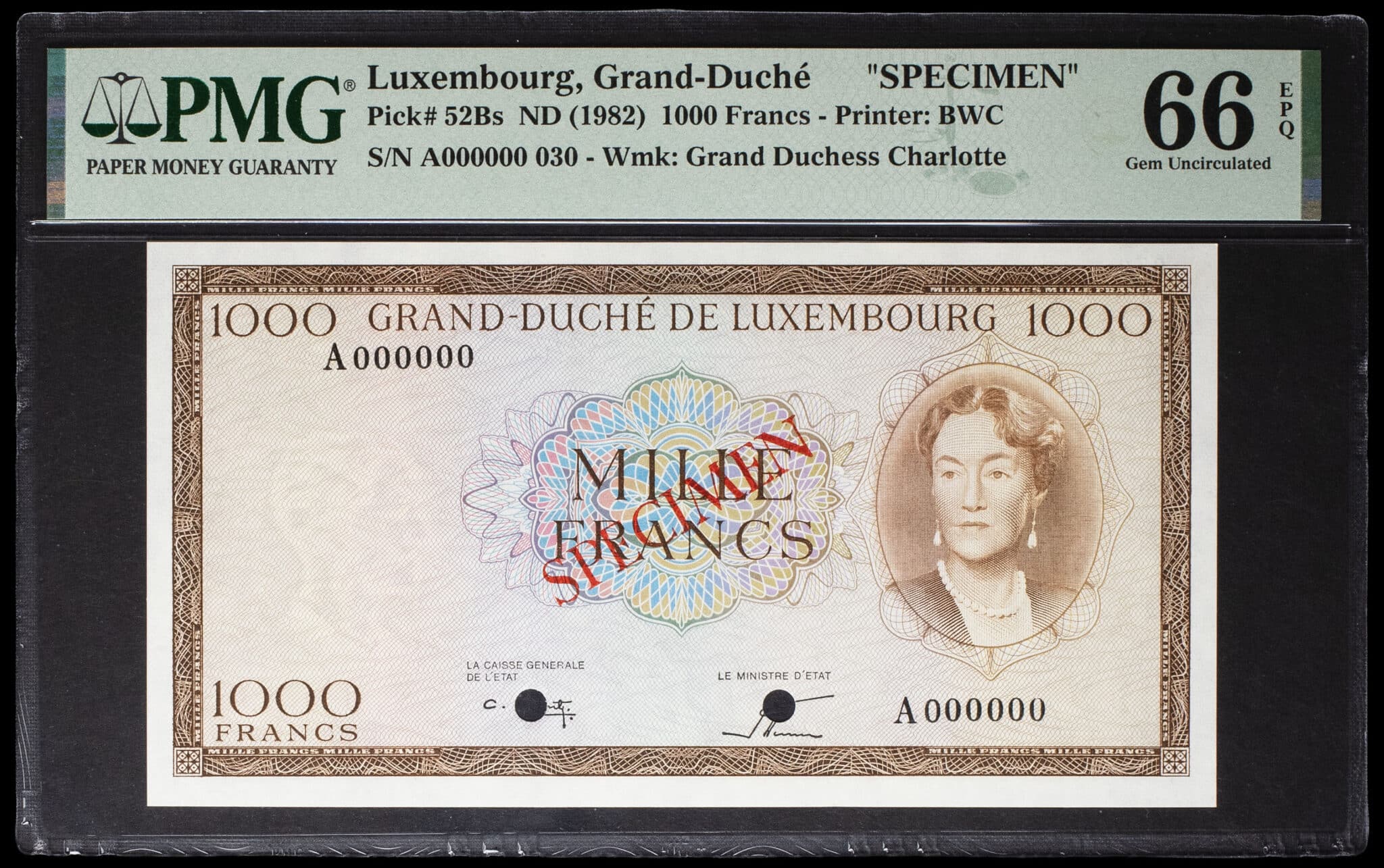 - 1000 francs avec le portrait de la grande-duchesse Charlotte (SPÉCIMEN) ND (1982).