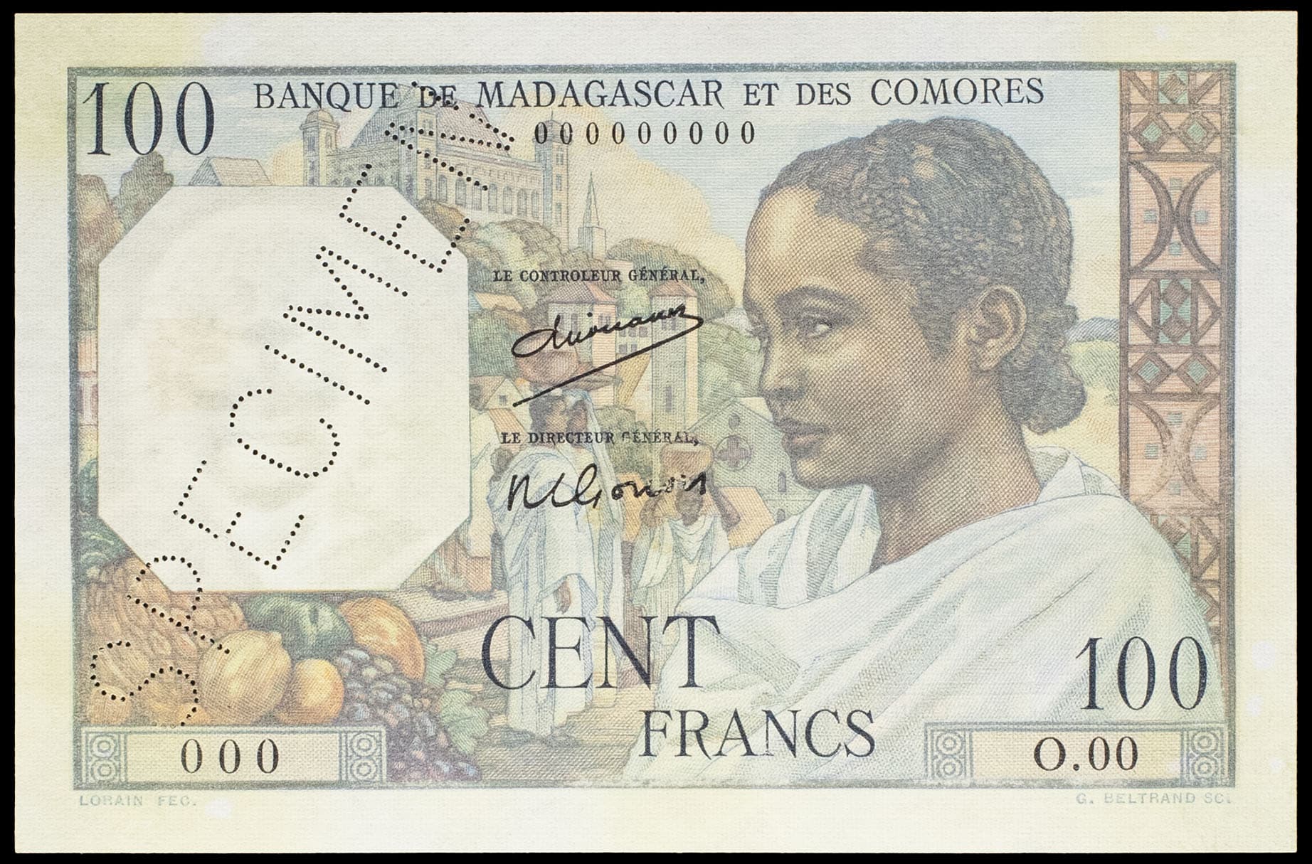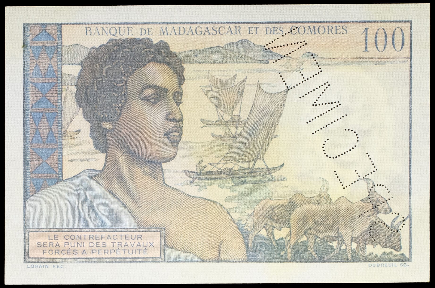 - 100 francs type “femme Hova et rova d’Antananarivo” (SPÉCIMEN) ND (1950).