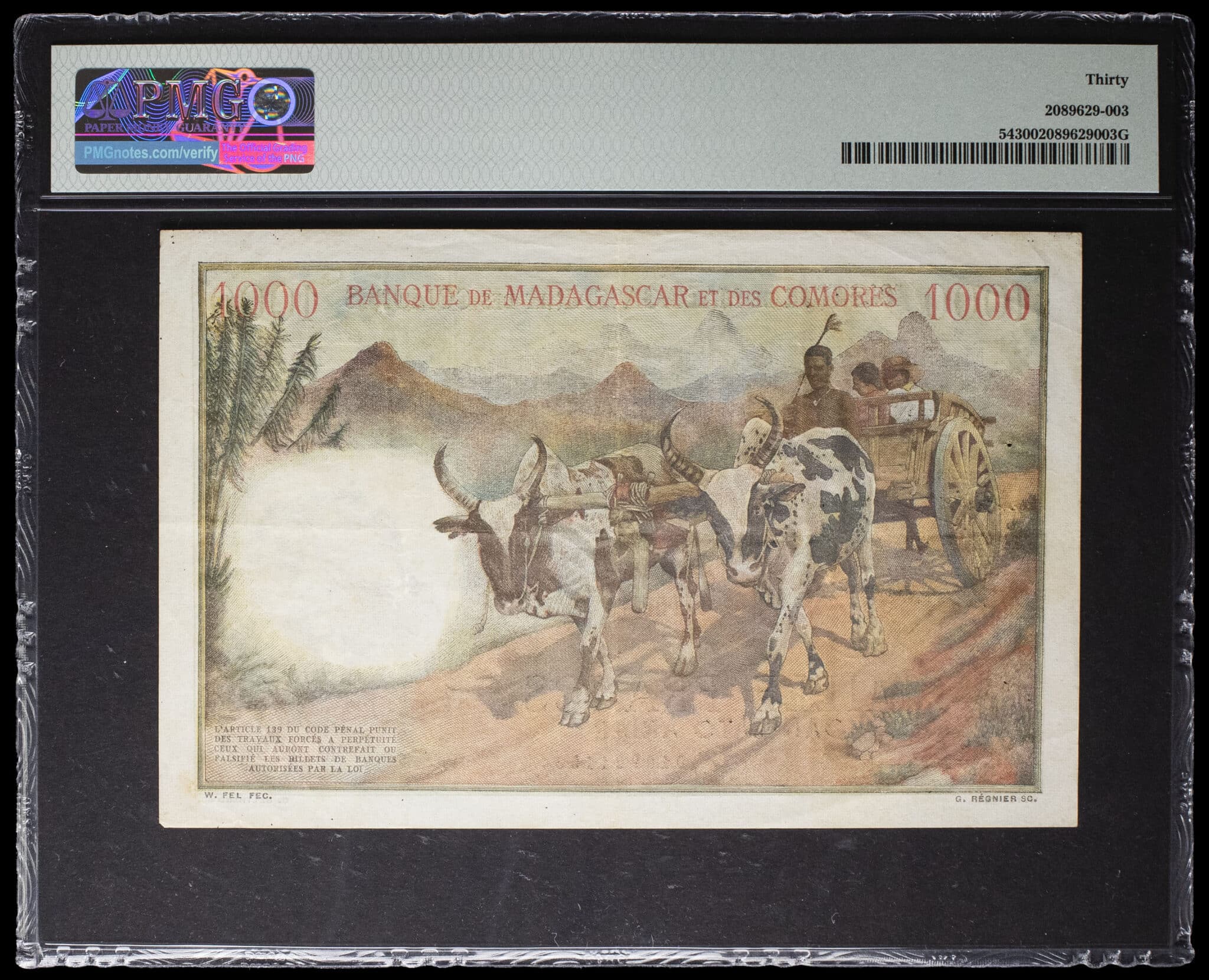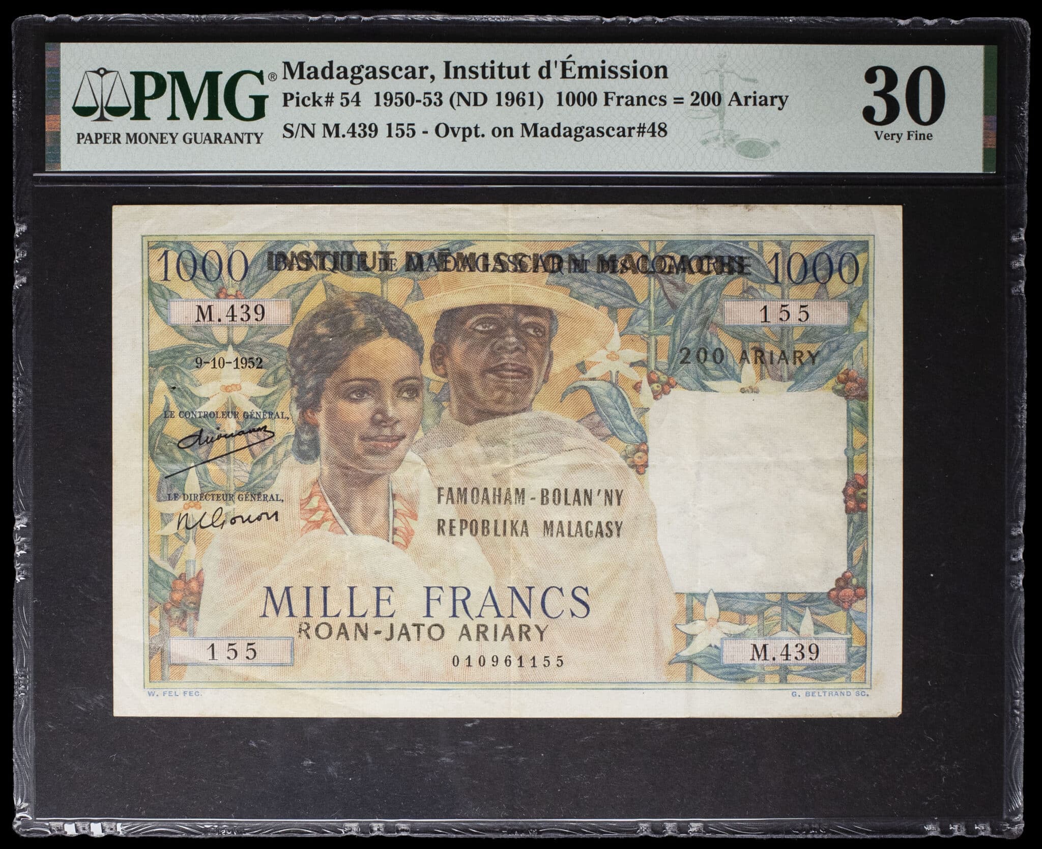- 200 ariary surchargé sur 1000 francs type “couple indigène des Hauts Plateaux” - Institut d’Émission Malgache 9-10-1952 (1961).
