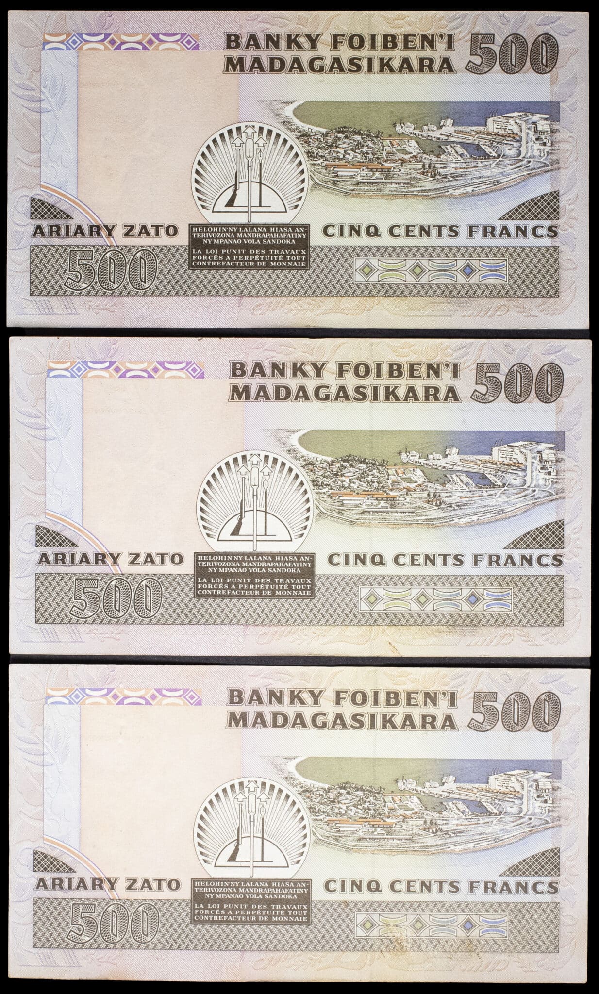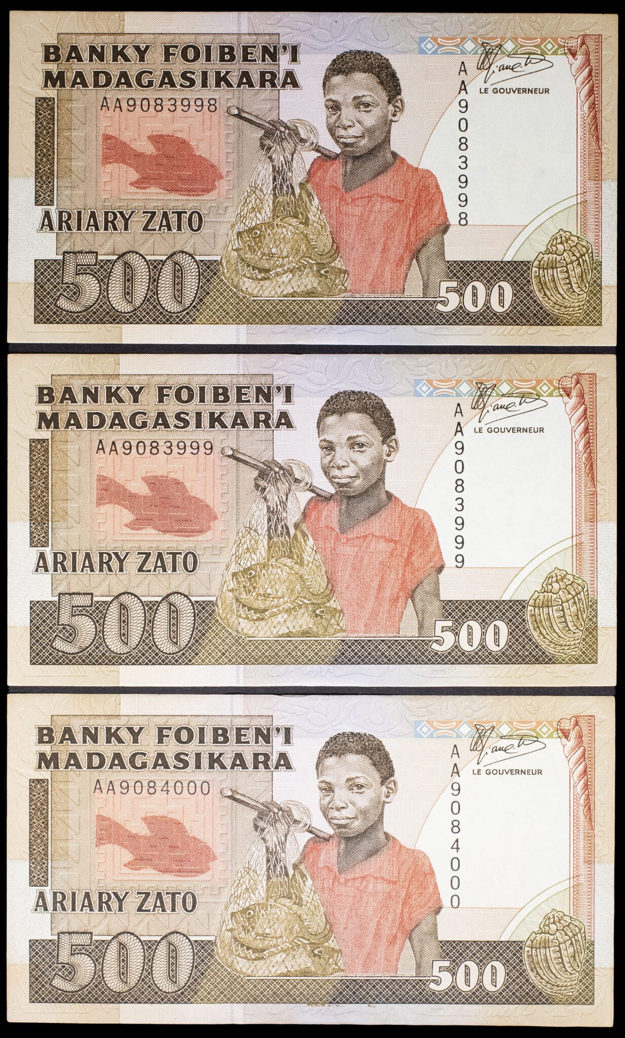 - Lot (3) - 500 francs / 100 ariary type “jeune pêcheur” avec numéros consécutifs ND (1988).