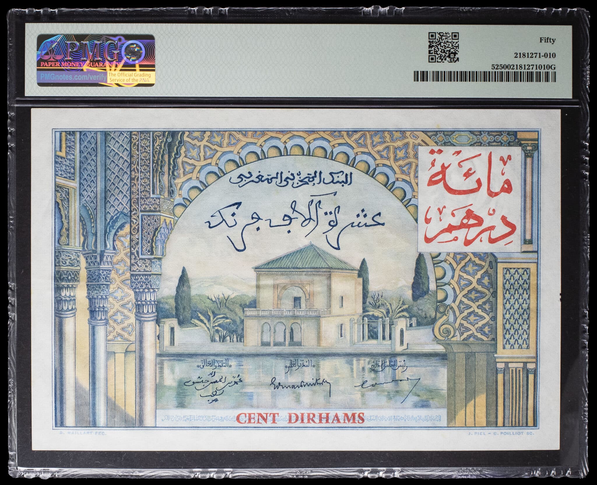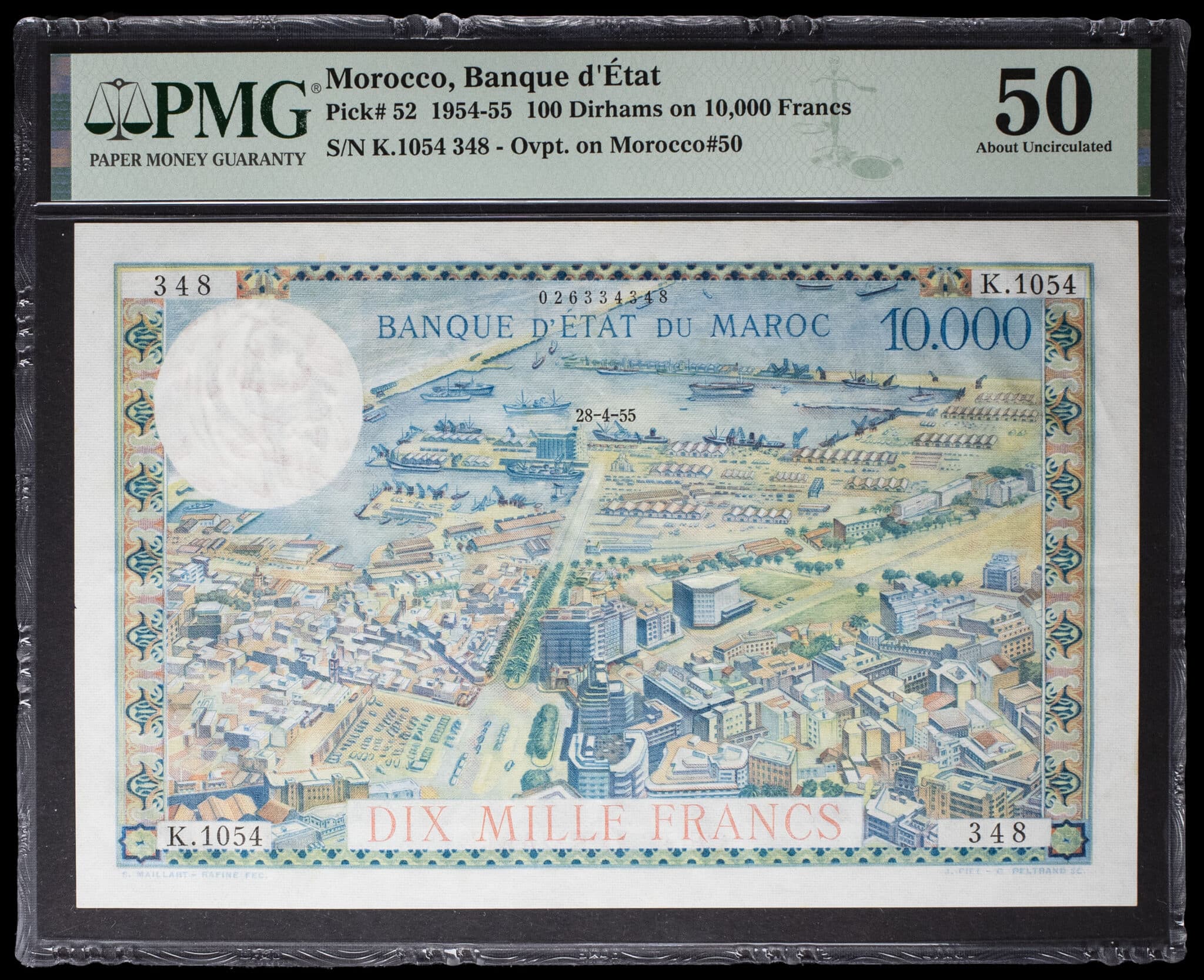 - MOROCCO 100 dirhams surchargé sur 10 000 francs type “vue de Casablanca” 28-4-1955.