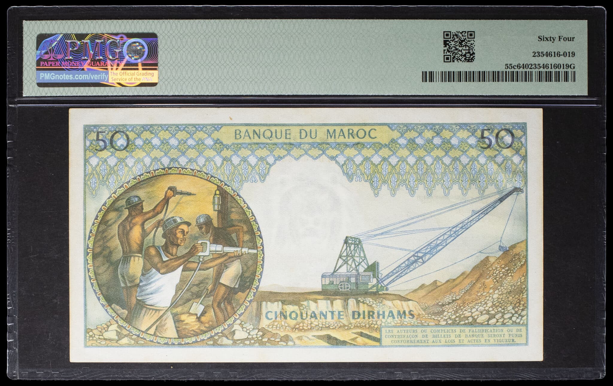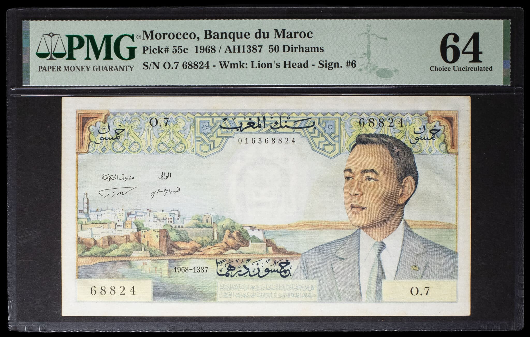 - MOROCCO 50 dirhams avec le portrait du roi Hassan II type “kasbah des Oudayas” 1968 / AH 1367.