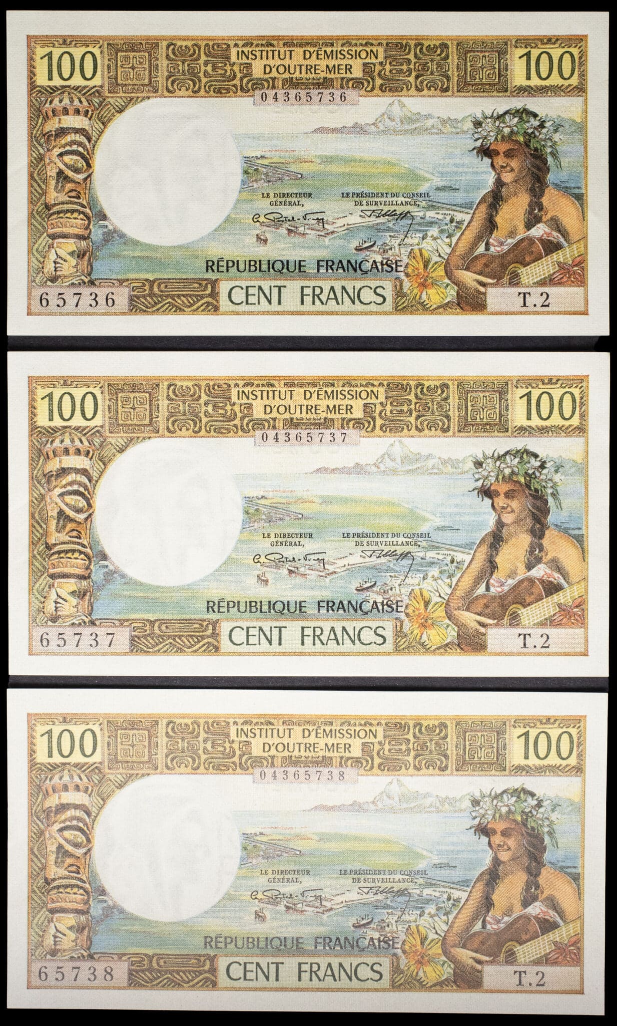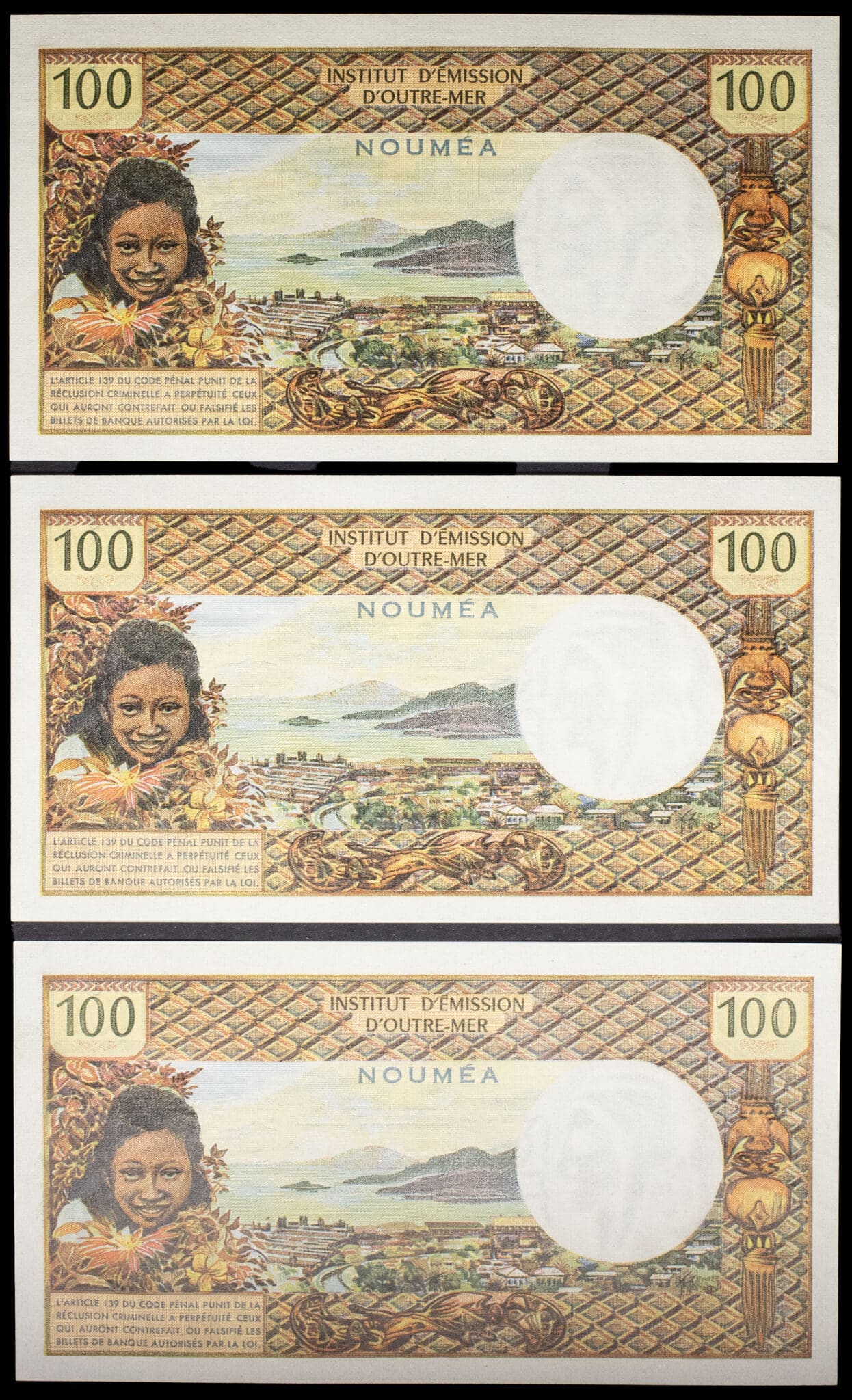 - NEW CALEDONIA Lot (3) - 100 francs, type modifié avec “RÉPUBLIQUE FRANÇAISE” et numéros consécutifs - Institut d’Émission d’Outre-Mer ND (1972).
