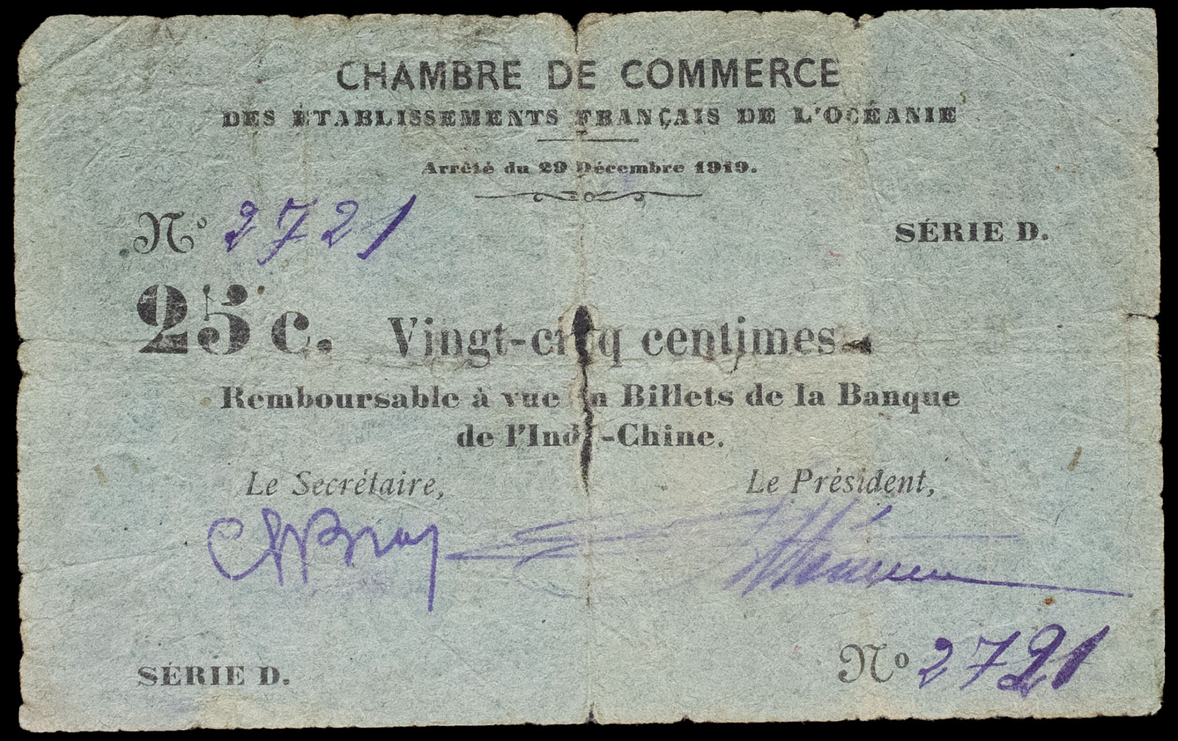 - FRENCH POLYNESIA / FRENCH OCEANIA 25 centimes type “Chambre de Commerce”, première émission 29 décembre 1919.