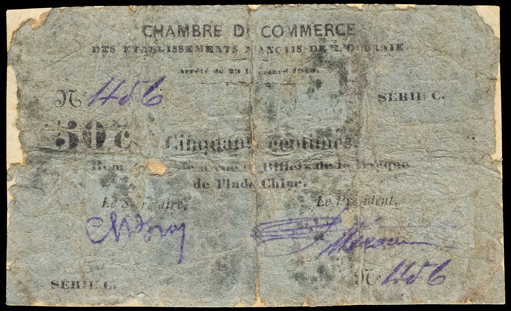 - FRENCH POLYNESIA / FRENCH OCEANIA 50 centimes type “Chambre de Commerce”, première émission 29 décembre 1919.