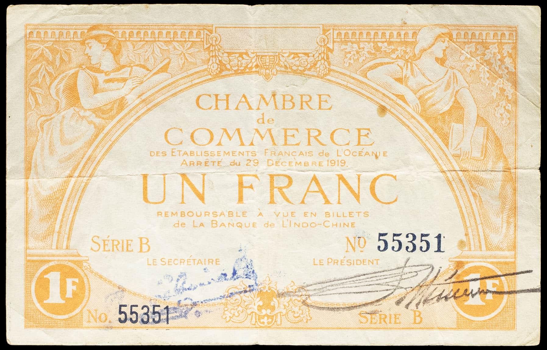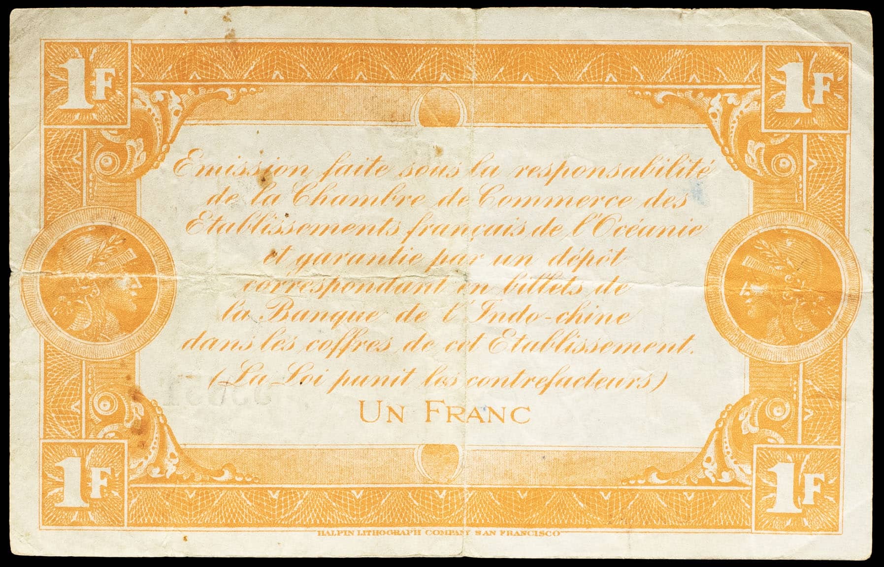 - FRENCH POLYNESIA / FRENCH OCEANIA 1 franc type “Chambre de Commerce”, deuxième émission 29 décembre 1919.