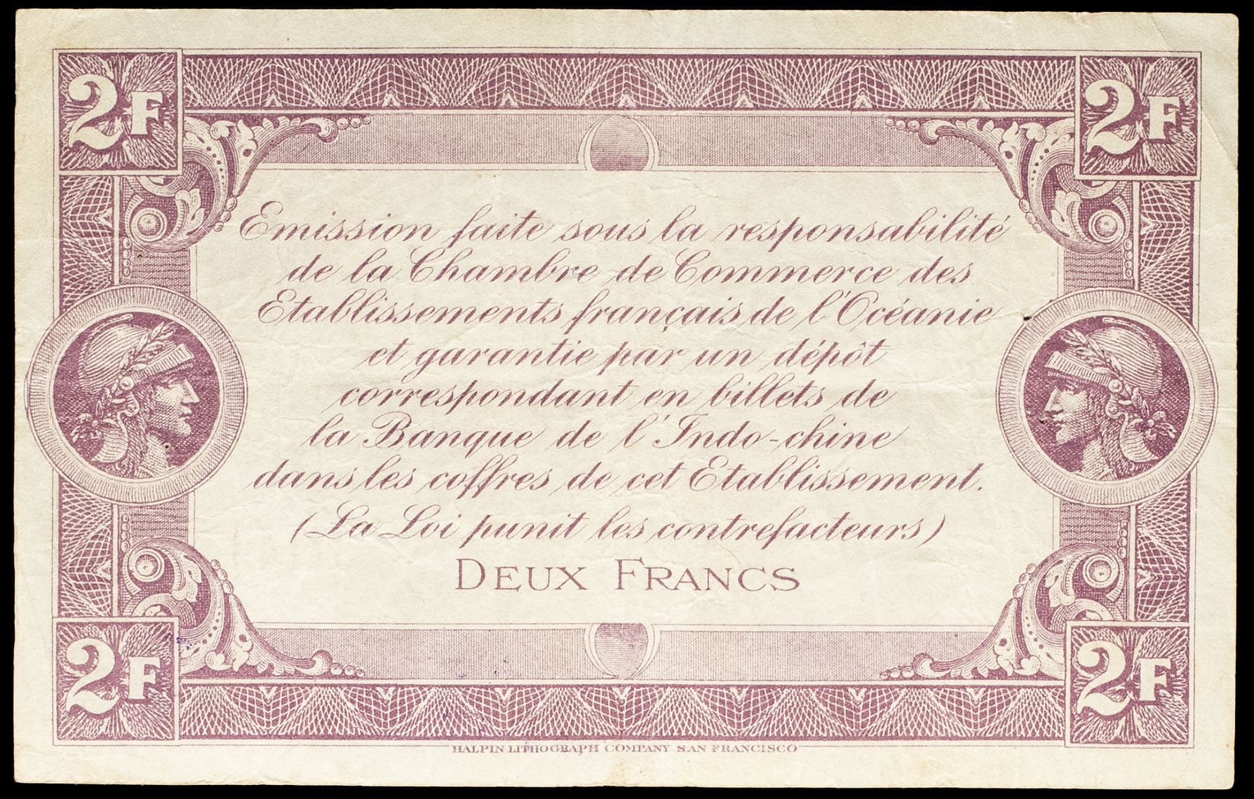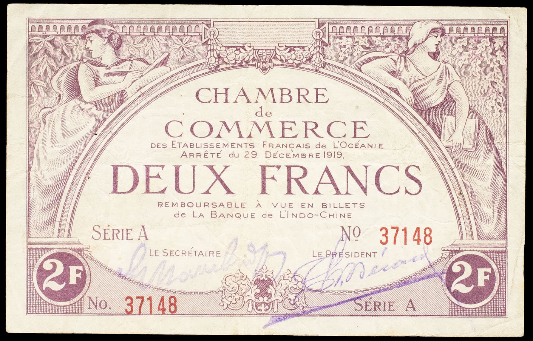 - FRENCH POLYNESIA / FRENCH OCEANIA 2 francs type “Chambre de Commerce”, deuxième émission 29 décembre 1919.