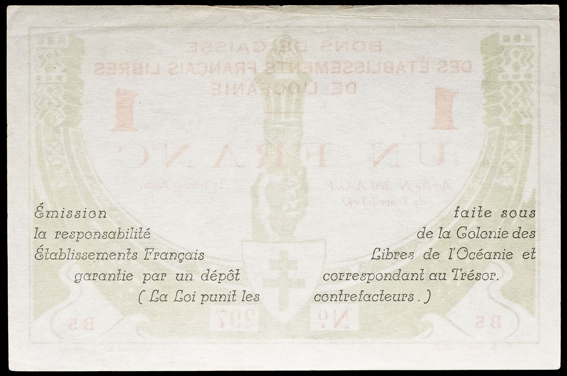 - FRENCH POLYNESIA / FRENCH OCEANIA Bon de caisse de 1 franc type “vert et rouge” - Établissments Français libres de l’Océanie 7 avril 1942.